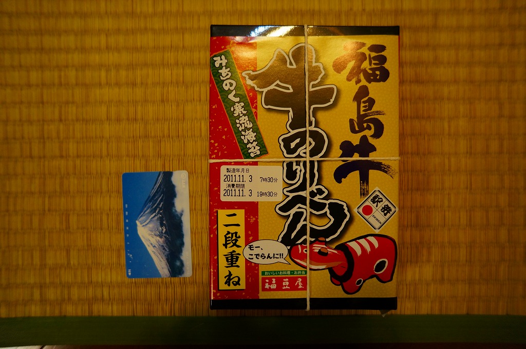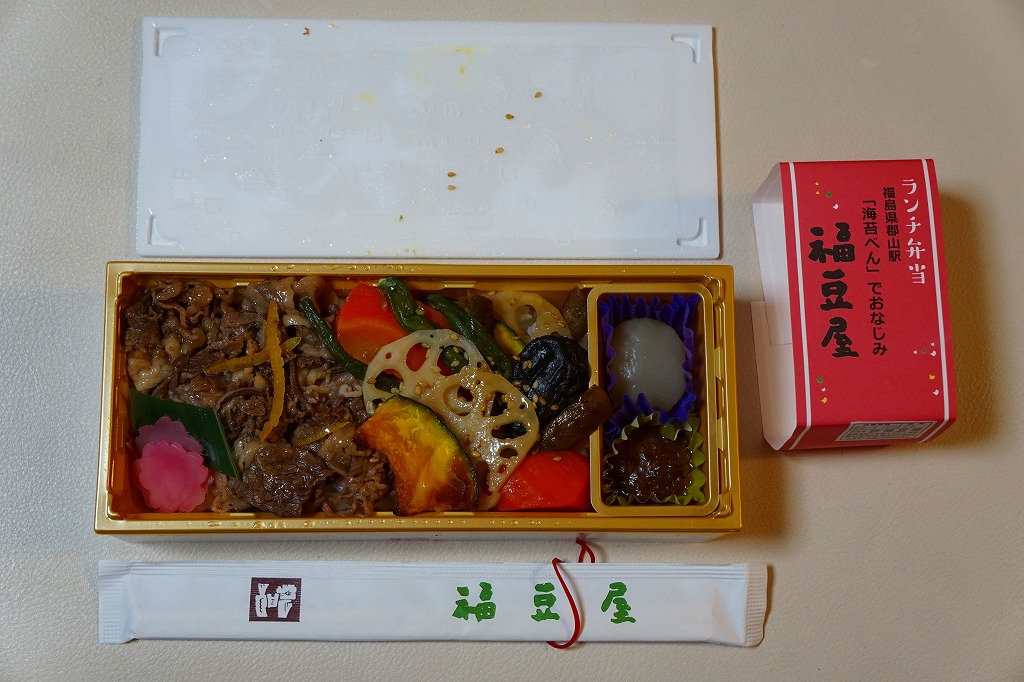 これは商品名のとおり、郡山駅の駅弁屋である福豆屋のもの。御飯を牛肉煮とニンジンやカボチャやレンコンなどで覆う、前週に京王百貨店の駅弁大会で買った「野菜畑の牛めし」と同じものだった。