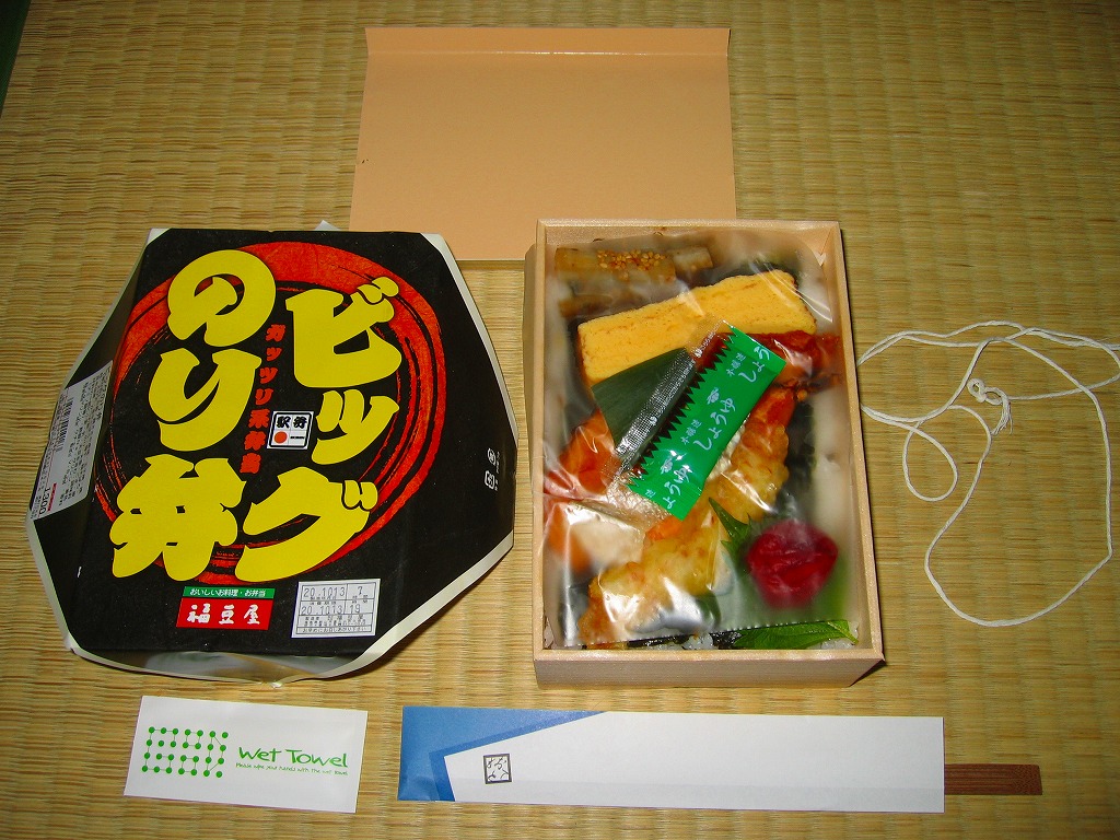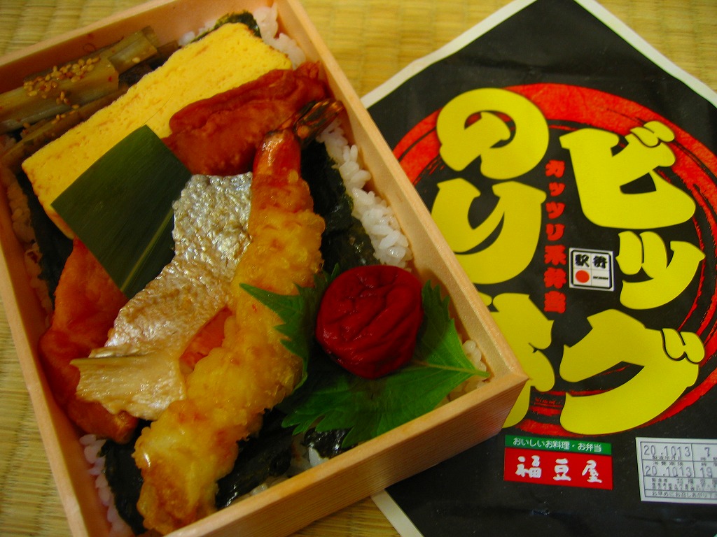 2008(平成20)年10月12日と13日に東京駅で開催された「東日本縦断駅弁大会−秋−」で販売されたお弁当で、全8種が誕生した「メガ駅弁」のひとつ。二段重ねかと思うほどの高さがある木目調の容器にボール紙でふたをして、商品名を力強く描いた掛紙をかけて、ひもで十字にしばる。中身は白御飯を海苔ととりそぼろとカツオブシで3層に重ね、鶏ササミ唐揚、玉子焼、焼鮭、海老天、きんぴら、梅干しなどを載せるもの。具はいずれもビッグで、名は体を表す見事なガッツリ系。