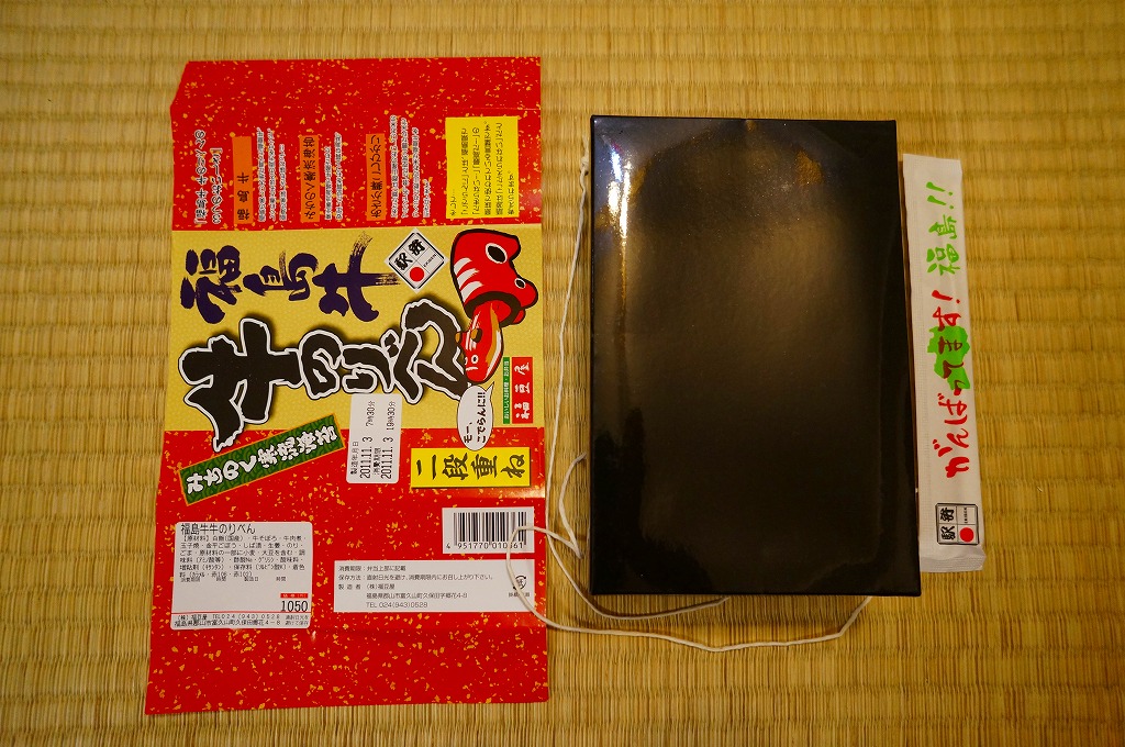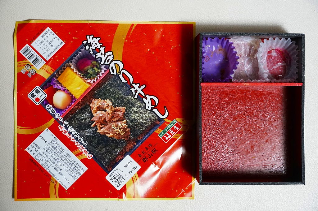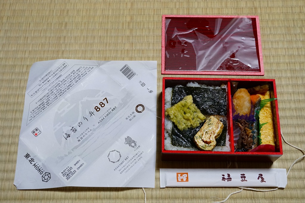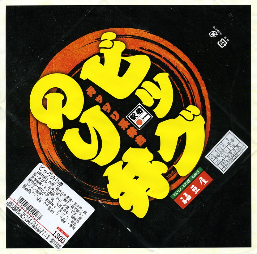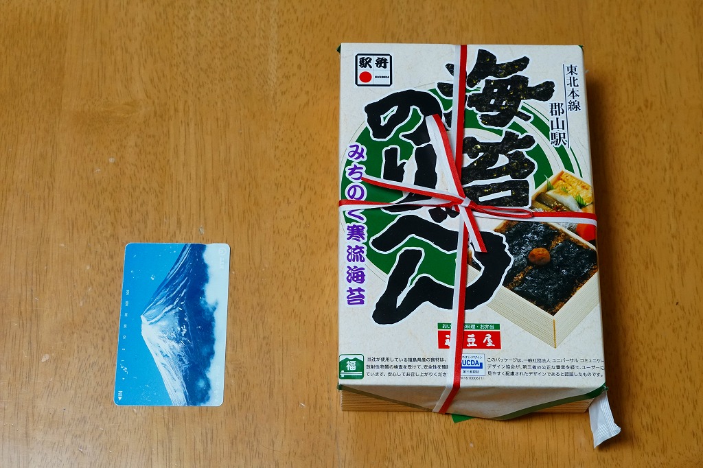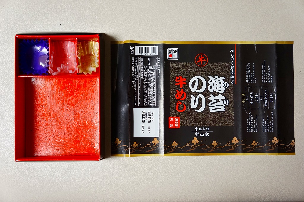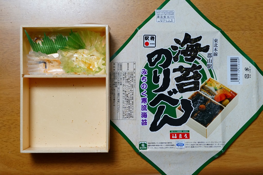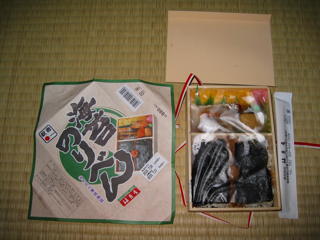 分量が通常版の1.5倍というが、郡山駅の駅弁ではこういう商品を思い当たらない。それでも、地元で仕出し屋や弁当屋としても親しまれているであろう駅弁屋が、ホカ弁の定番メニューであるのり弁当について、大真面目に拡大コピーした爽快な試みは、駅弁イベントを大いに盛り上げるものだろう。現地で売られていても楽しそう。