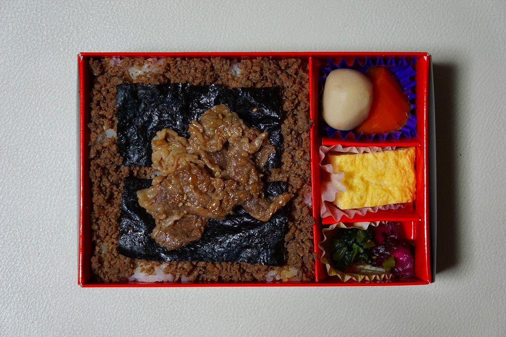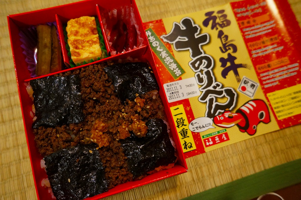 つまり既存の郡山駅弁「海苔のりべん」のおかずを減らし、おかかを牛そぼろに置き換えた感じ。飯の上と中で2層の牛そぼろは甘辛が強いうえ分量も多く、まるでライスバーガーを食べているような感じ。東京駅の駅弁大会における郡山駅弁の主力は、海苔弁になったような。2014年までの販売か。