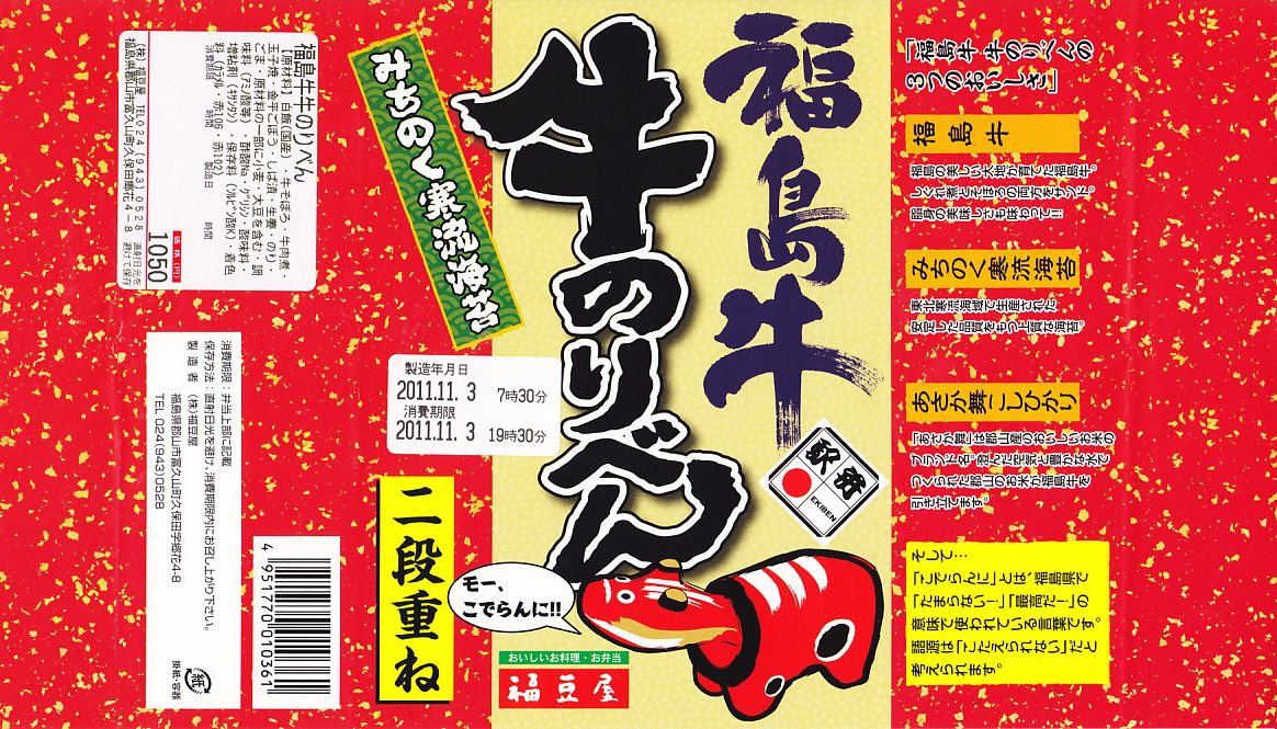 2011年3月5日と6日に東京駅で開催された「“はやぶさ”デビュー記念駅弁大会」でデビューか。赤いボール紙の長方形の容器に黒いふたをして、駅弁の名前と牛べこと宣伝文を描いた赤い掛紙を巻く。中身は郡山産コシヒカリ「あさか舞」の白御飯の上と中に福島牛のそぼろを入れ、海苔を貼り付け、玉子焼とごぼう煮と柴漬けを添えるもの。