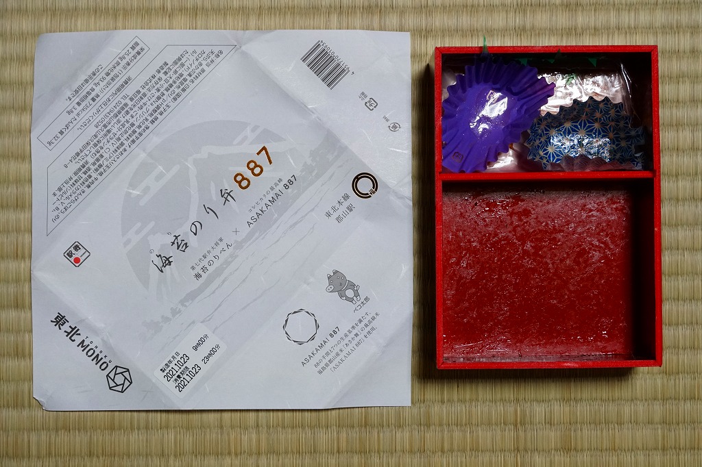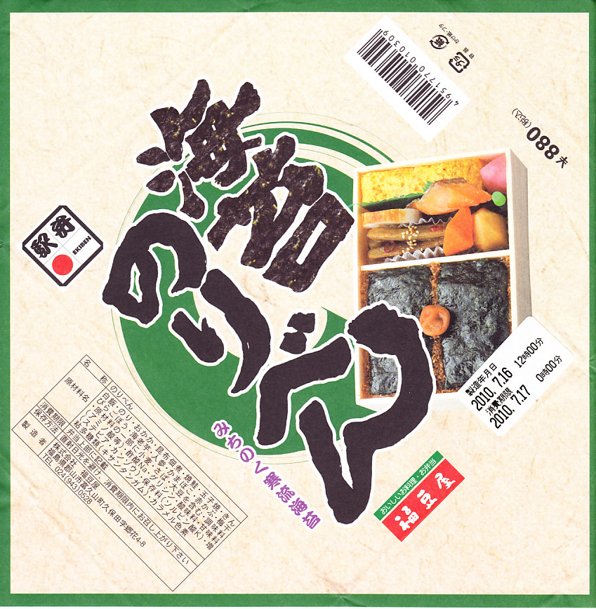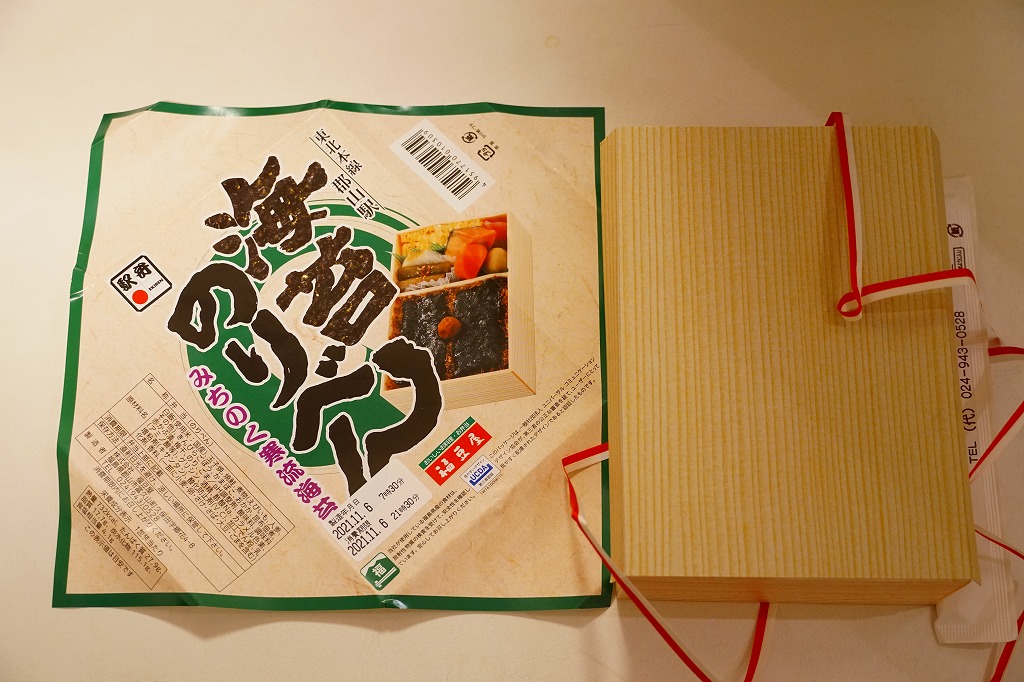 2021(令和3)年11月6日に購入した、郡山駅弁の掛紙。この「海苔のりべん」の掛紙そのものは、上記の2019年に栄養成分表示を加えた程度で、下記の2021年1月のものと変わらない。外圧に負けた今の世に珍しく、消費期限のラベルに製造年月日の表示が復活しており、これには驚いた。