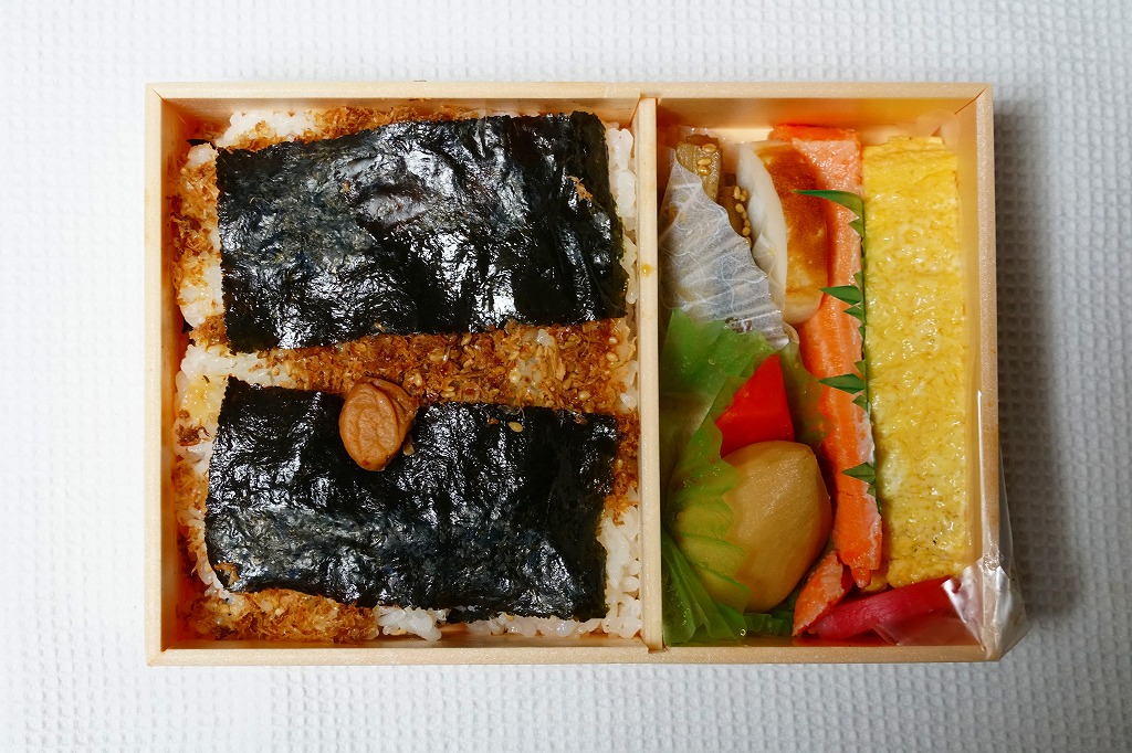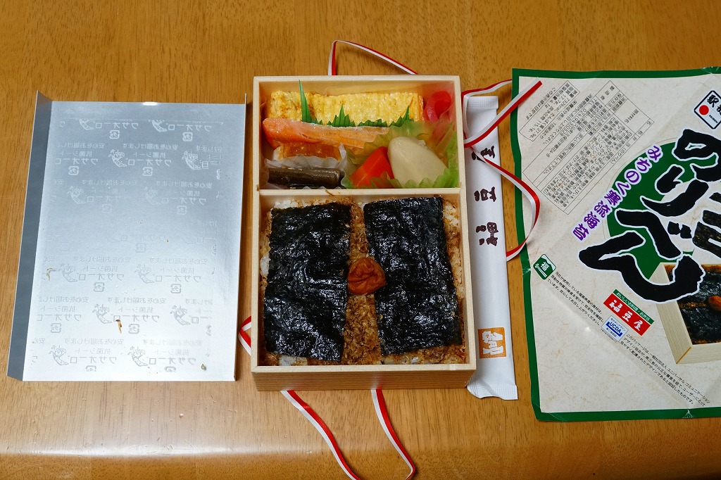 長方形の容器を、駅弁の大きな名前と写真を印刷した掛紙ですっかり覆う。中身は白御飯を詰めて昆布つくだ煮をまぶして海苔を貼り、さらに白御飯を詰めておかかをまぶして海苔を貼り梅干しを載せた、二段重ねの海苔御飯に、大きな玉子焼、焼鮭、大切りのきんぴらごぼう、海老芋、かまぼこ、赤かぶなど。