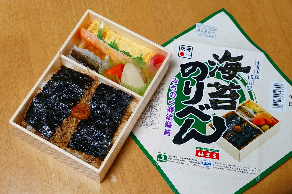 2010(平成22)年の発売か。2008(平成20)年10月の東京駅の駅弁大会で売られたメガ駅弁「ビッグのり弁」の通常版か。2015(平成27)年8月のTBSテレビ「マツコの知らない世界」や、2016(平成28)年9月のTBSテレビ「この差って何ですか?」など、いくつかのテレビ番組や特集コーナーで駅弁マニアの1位その他高い評価を得て、今では最も有名な郡山駅弁。