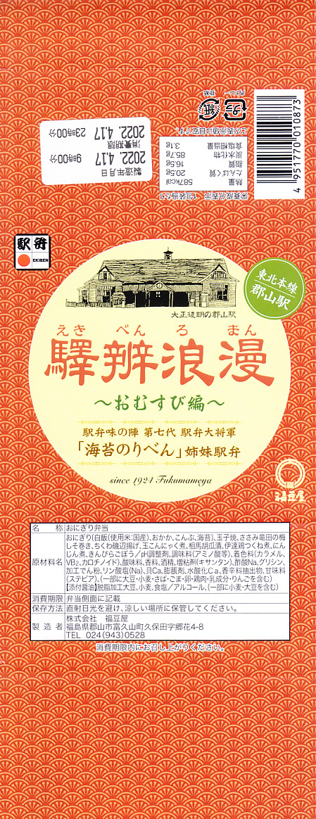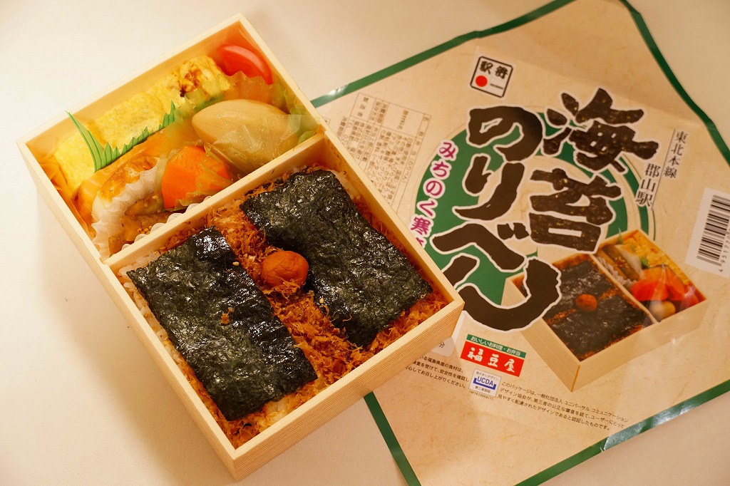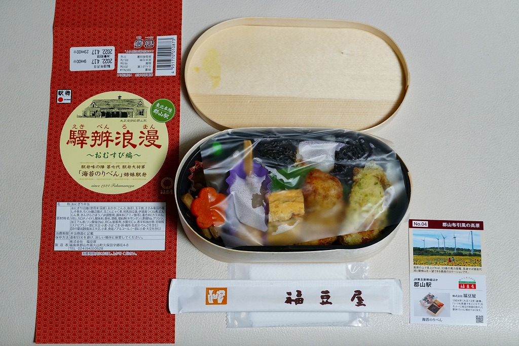 駅弁の名前は新字体で「駅弁浪漫」とも。日本鉄道構内営業中央会が駅弁誕生135周年を記念して、会員のうち21社が2020(令和2)年4月10日から販売した、駅弁の原点であるおにぎりをメインとした記念弁当「駅弁誕生135周年おにぎり弁当」の、郡山駅バージョン。1,200円で5月まで販売されたのち、2022(令和4)年の4月10日から24日まで、駅弁の日に合わせ、日本鉄道構内営業中央会の会員のうち21社が、FMヨコハマのラジオ番組「FUTURESCAPE」とタイアップし、この年の4月10日から各社の駅売店などで販売した、駅弁の日記念のおにぎり駅弁の郡山駅バージョン、加えて「海苔のりべん」姉妹駅弁として、900円で再び販売された。