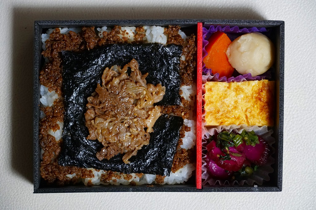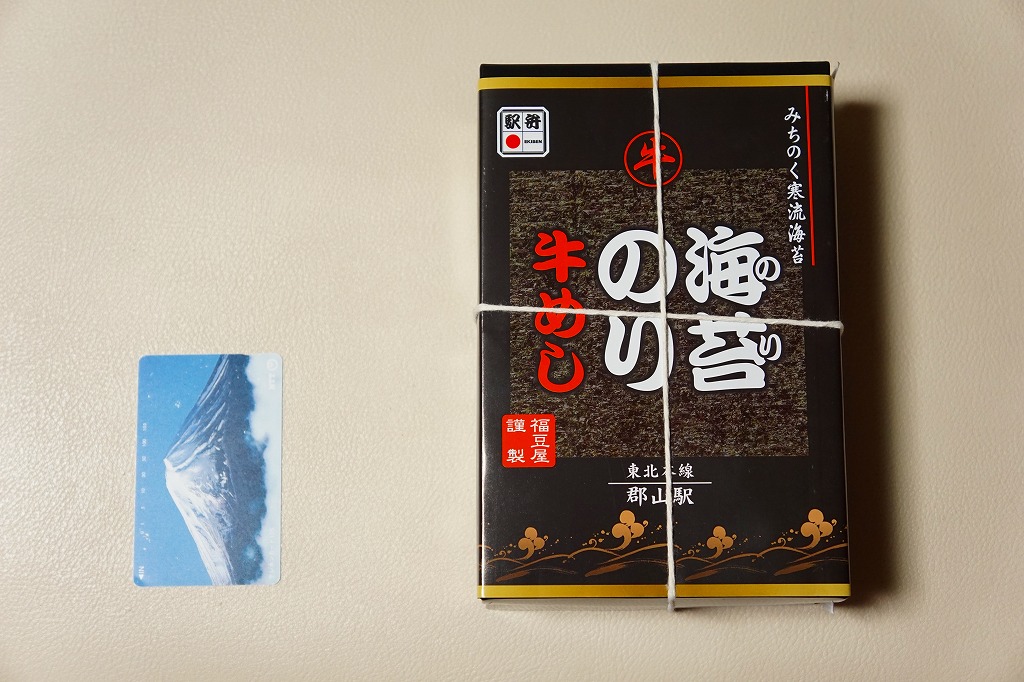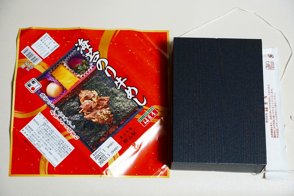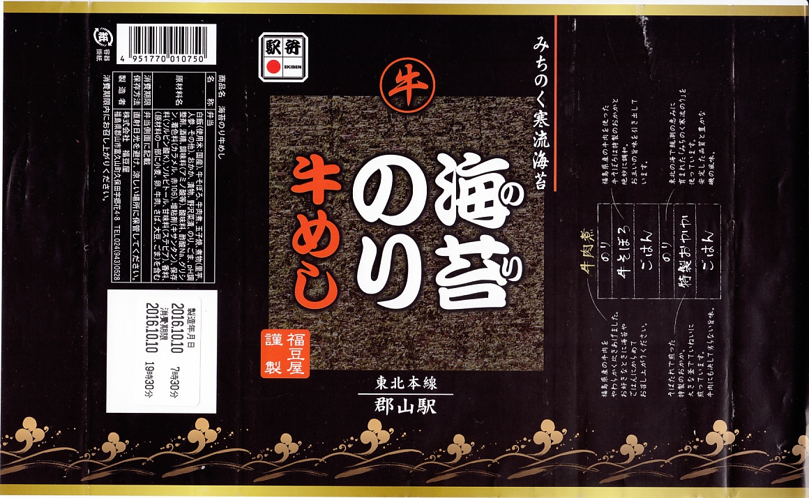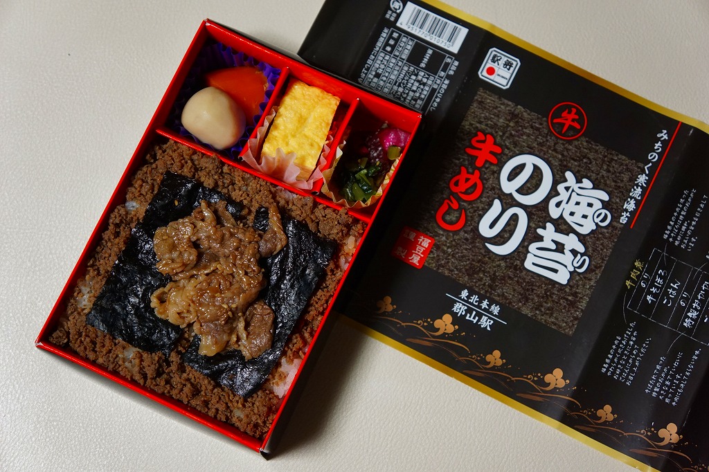 2016(平成28)年9月20日の発売。翌10月にJR東日本の駅弁キャンペーン「駅弁味の陣2016」にエントリー。その名のとおり、郡山駅の人気駅弁「海苔のりべん」の姉妹品だろう。2024年3月に下記の黒いものから写真入り赤色のものへ変わった掛紙をかけた、真っ黒な長方形の発泡材容器で、白御飯の上におかかを載せ、海苔で覆い、白御飯を載せ、牛そぼろと海苔で覆い、牛肉煮で覆う、御飯と海苔のサンドイッチ。これに玉子焼、煮物、漬物を添える。濃いめの味は美味くても、これではただの牛肉駅弁なので、東京駅での大注目を再び、とはいかないかもしれない。価格は2016年の発売時で1,150円、2020年時点で1,200円、2023年時点で1,300円、2025年時点で1,400円。