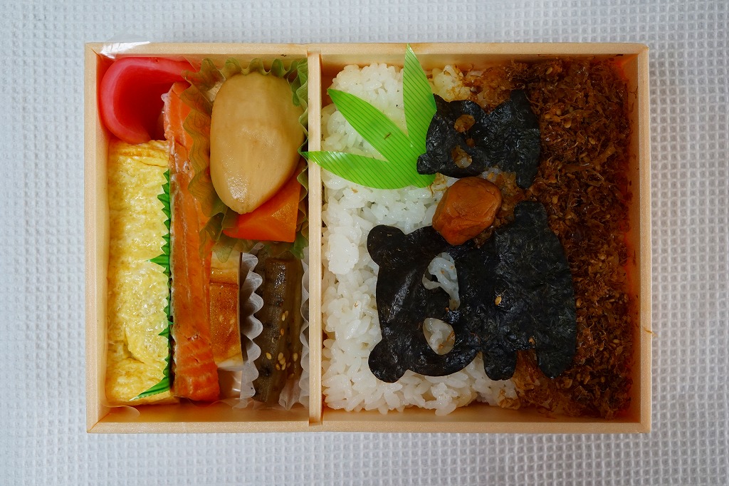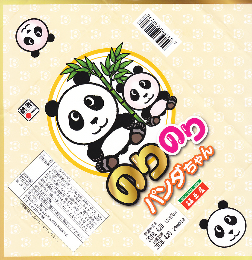 2018(平成30)年3月の発売。中身は東京で人気が出た郡山駅弁「海苔のりべん」と同じく、白御飯を詰めて昆布つくだ煮をまぶして海苔を貼り、さらに白御飯を詰めておかかをまぶして海苔を貼り梅干しを載せた、二段重ねの海苔御飯に、大きな玉子焼、焼鮭、大切りのきんぴらごぼう、海老芋、かまぼこ、赤かぶなど。その海苔の形状が大小の、おそらく親子のパンダ型になっている。掛紙は海苔のりべんの硬派なものとは対極的な、親子の二頭身パンダの目が垂れるゆるーい絵柄。半年間ほどの販売か。