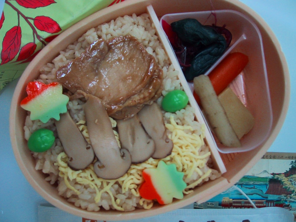 郡山駅の松茸駅弁。形の良い楕円形の容器に茶飯を敷いて、薄く小さい松茸が4切れとこちらも小ぶりな鶏肉が一切れ、あとは銀杏や麩など見た目を彩るための食材がいくつか添えられる。松茸は高価な食材だとはいえ、これだけ御飯に対するおかずが少なくては美味い福島米でもカバーできない。おかず満載の駅弁を同時に購入して分けて食べたいところ。価格は2003年の購入時で900円、2014年時点で950円。2014年までの販売か。