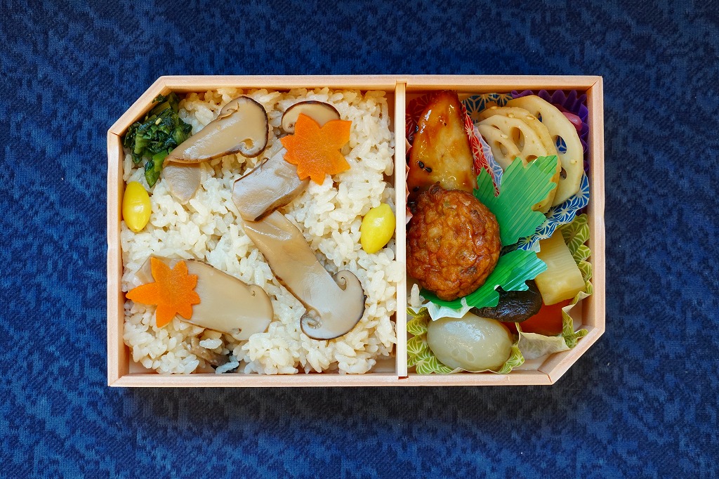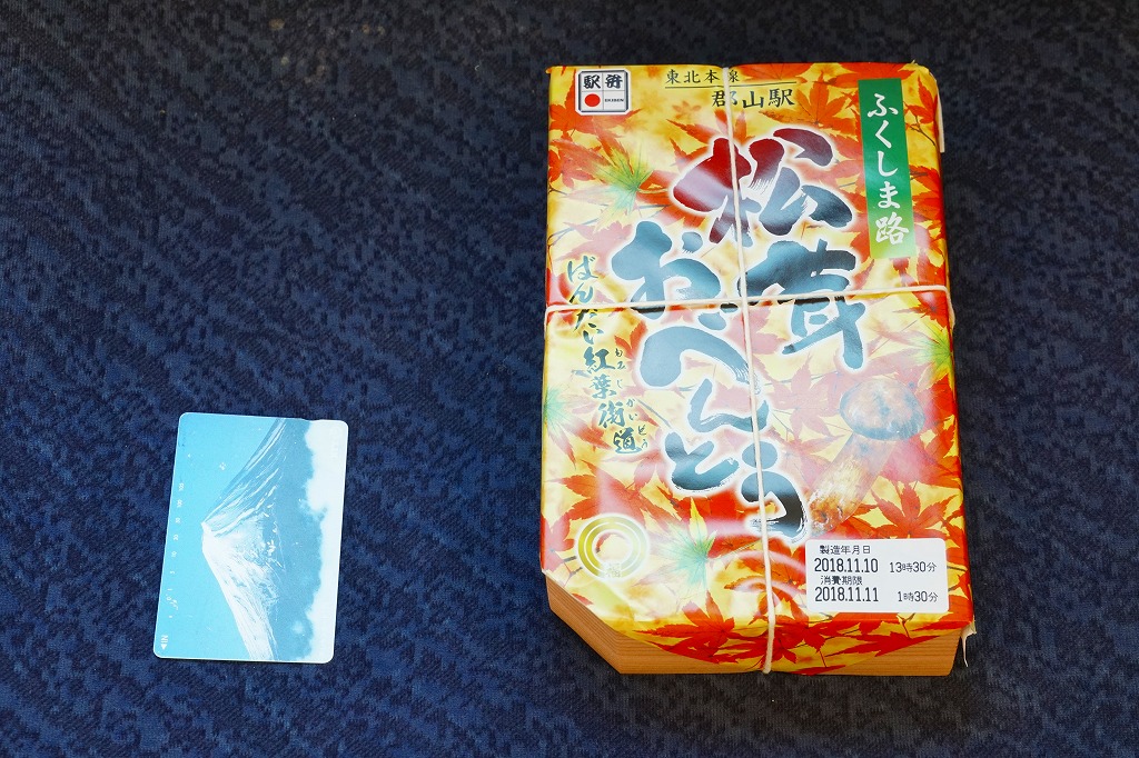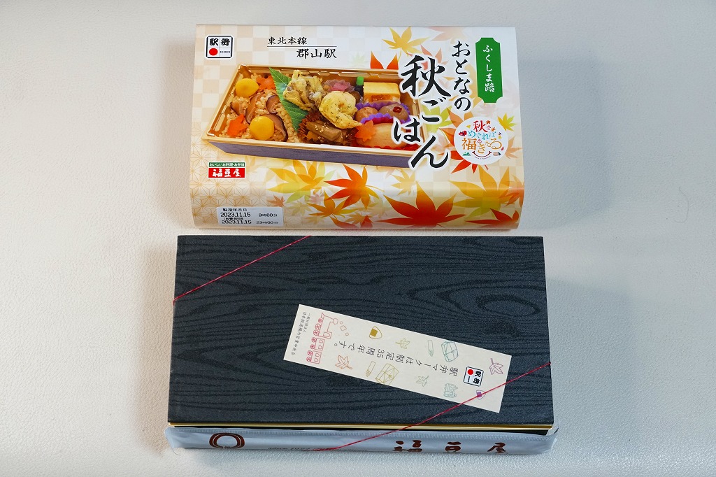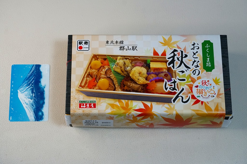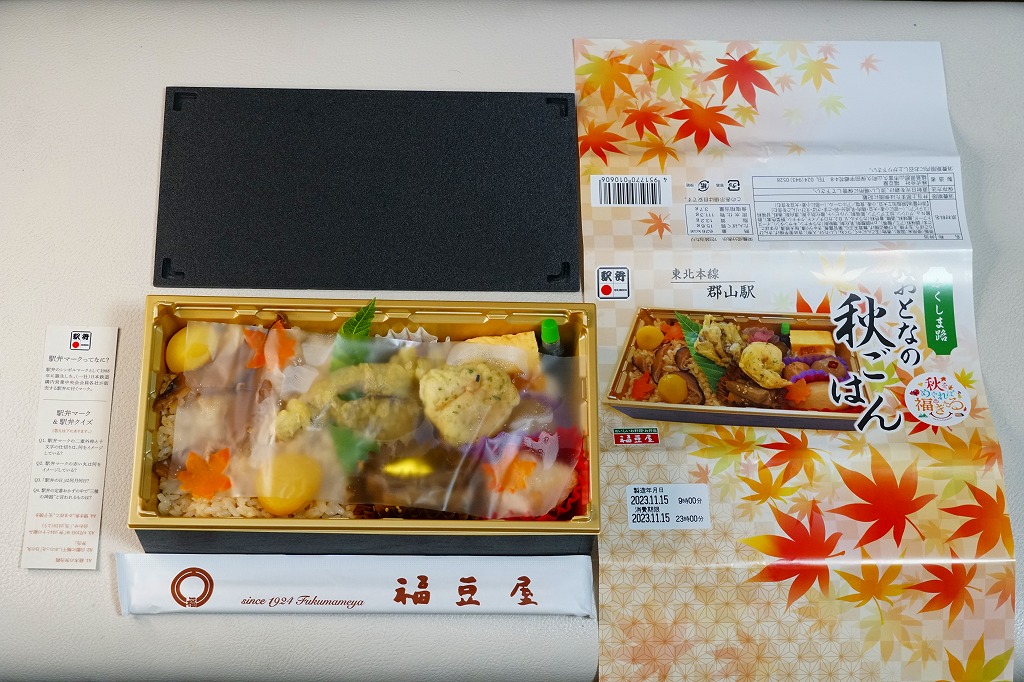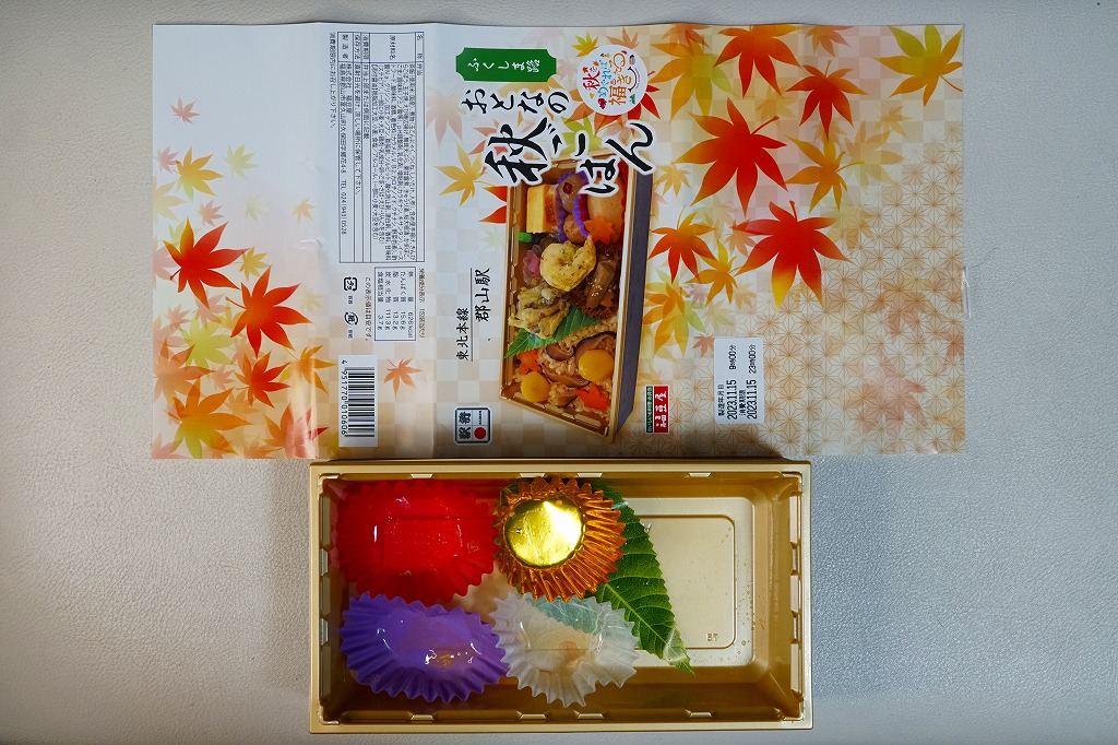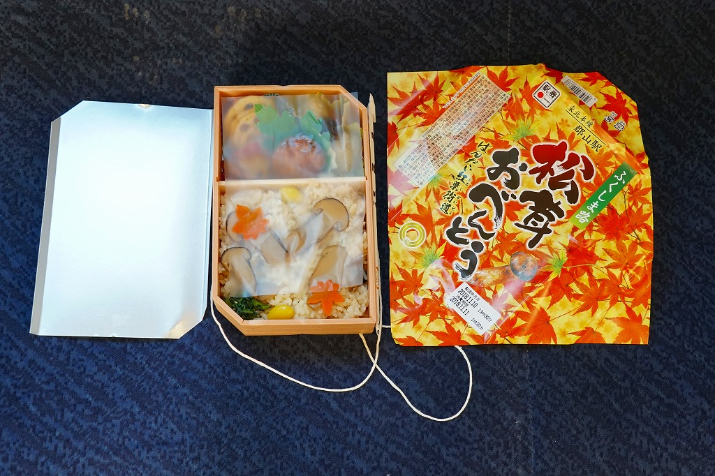 久々に見たような気がする、郡山駅のマツタケ駅弁。2014(平成26)年からこの姿で出ていた模様。秋の色と柄が豊かな掛紙に包まれた容器に、マツタケを載せたシメジ御飯、ニンジンやこんにゃくなどの煮物、野菜の五色揚げ、大学芋、れんこんのきんぴら、漬物を詰める。以前の野暮さや地味さはなく、マツタケは良い意味で目立たない印象。9月から11月までの販売か。価格は2015年時点で1,000円、2018年の購入時で1,050円、2020年時点で1,080円、2023年時点で1,100円。