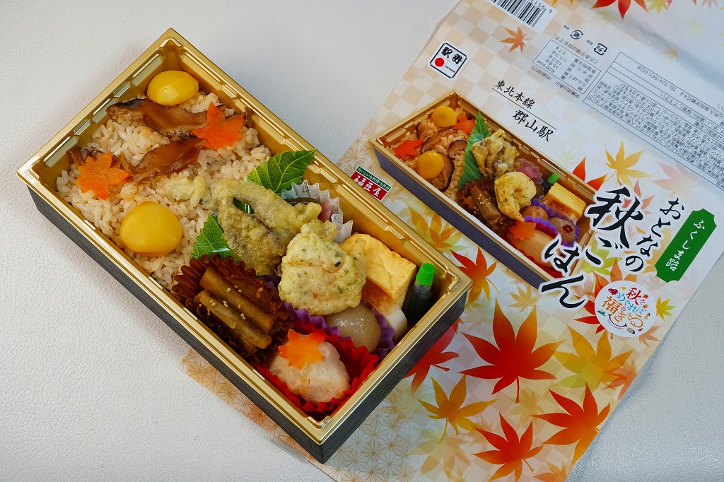JR東日本の駅弁キャンペーン「駅弁味の陣2013」へのエントリーに向けて、2013(平成25)年の夏までに発売。長方形のプラ容器に茶飯を詰め、クリとニンジンとしいたけで彩り、サトイモとエビとマイタケの揚げ物、カマボコと玉子焼、きんぴらごぼう、つくね、こんにゃくなどを添える。掛紙写真や実物の見栄えのとおり、うまくないはずがないという感じ。「福の島おとなの幕の内」に続き、ここでも駅弁の名前に使った「おとなの」とは何だろうかと思う。価格は2013年の発売時で1,000円、2018年時点で1,100円。