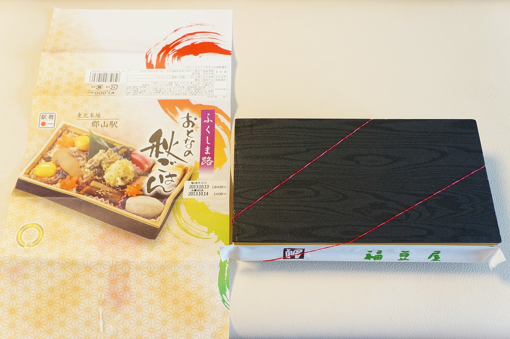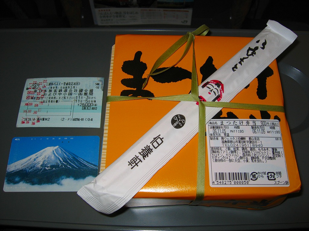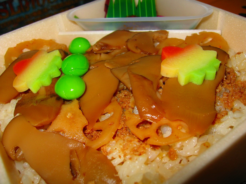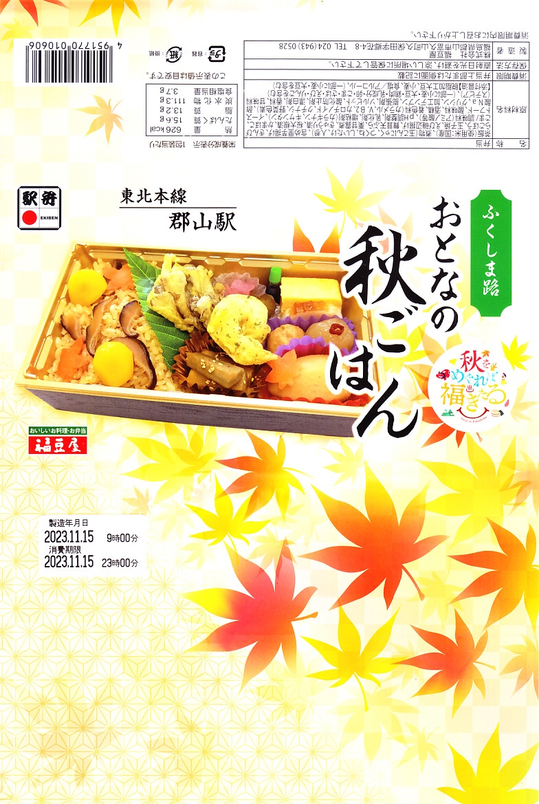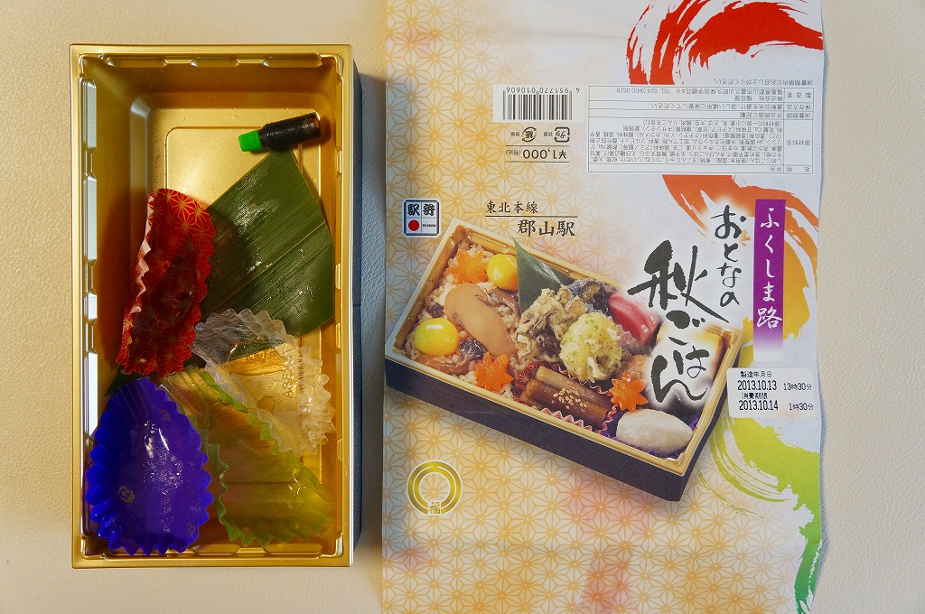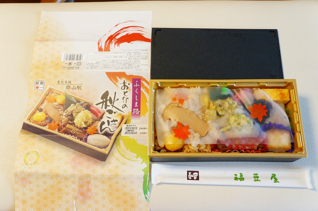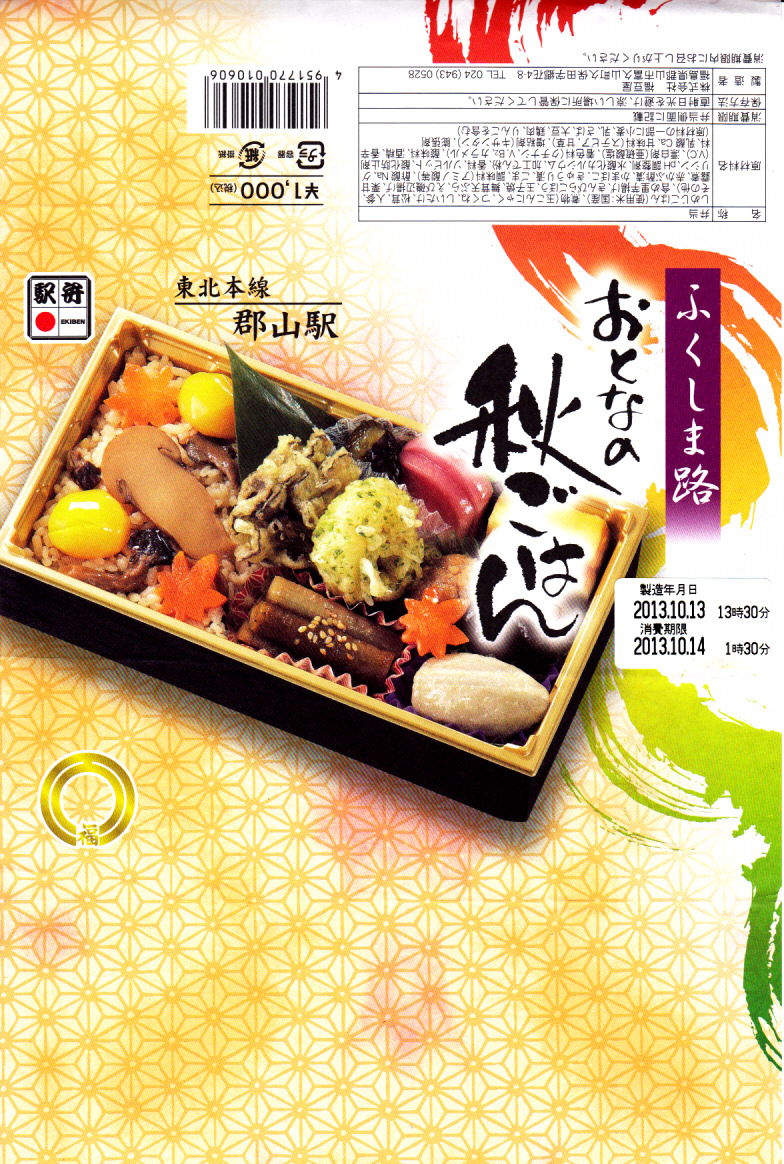 2013(平成25)年10月13日に購入した、郡山駅弁の掛紙。上記の2023年のものと、絵柄は異なるが、主旨は変わらない。中身もまた然り。長方形のプラ容器にシメジ御飯を詰め、クリとニンジンとマツタケで彩り、サトイモとエビとマイタケの揚げ物、カマボコと玉子焼、きんぴらごぼう、つくね、こんにゃくなどを添えた。