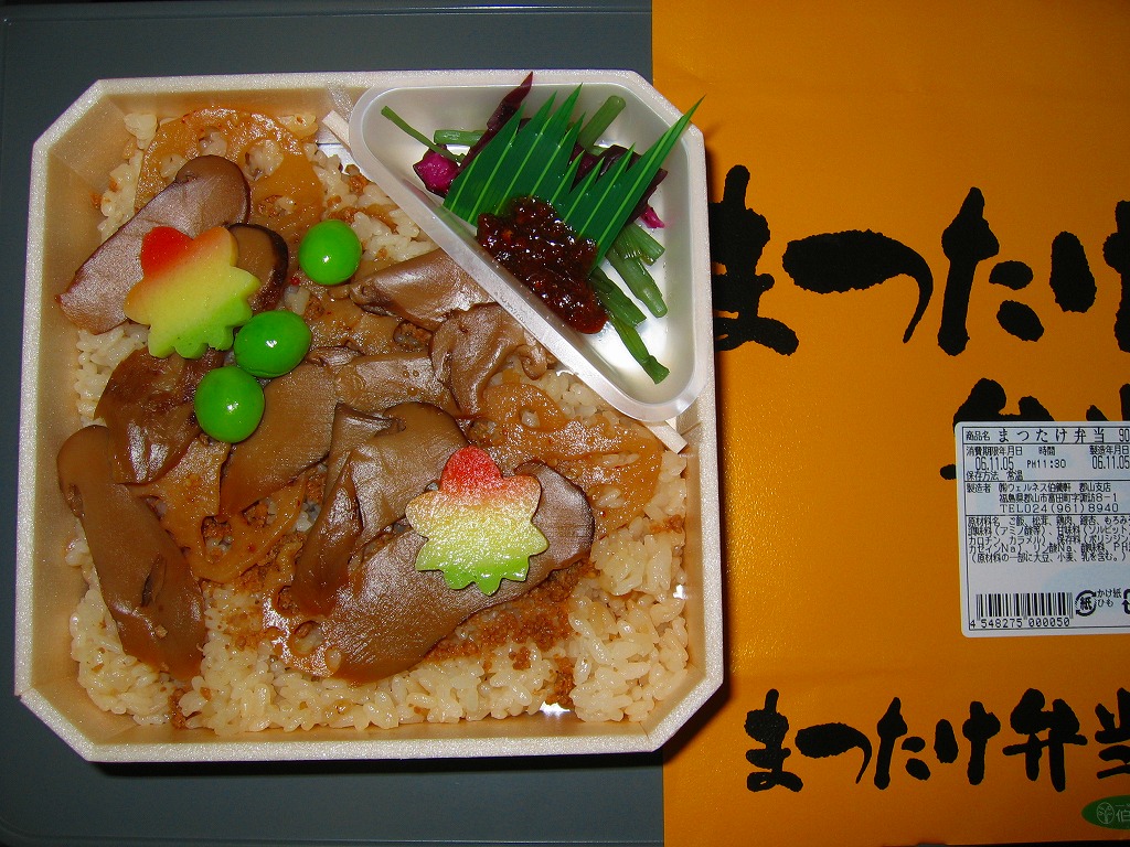 内容的に異色で、松茸の分量も比較的多い松茸駅弁なのだが、ふたを開けると辛味噌と柴漬けの刺激臭が漂い、松茸は鳥そぼろの強い味付けに負けて香りが飛んだ。属地不詳な掛紙でも、商品名を隠すようにべったり食品表示ラベルを貼るのも気になる。どこを切ってもつくりが雑な、がっかり駅弁。2015年時点で現存しない模様。