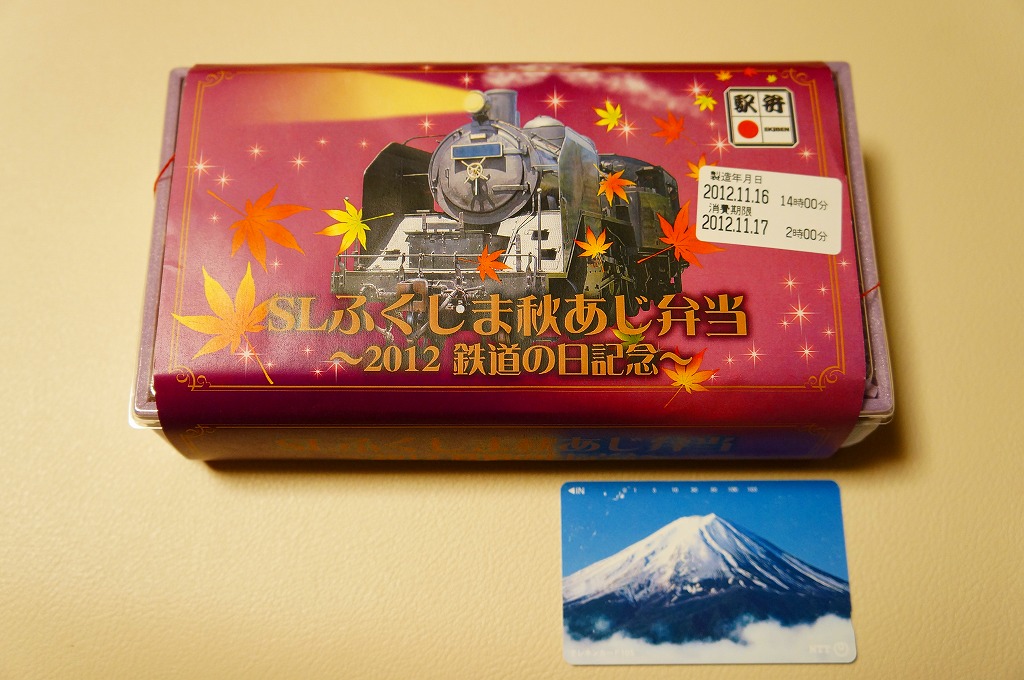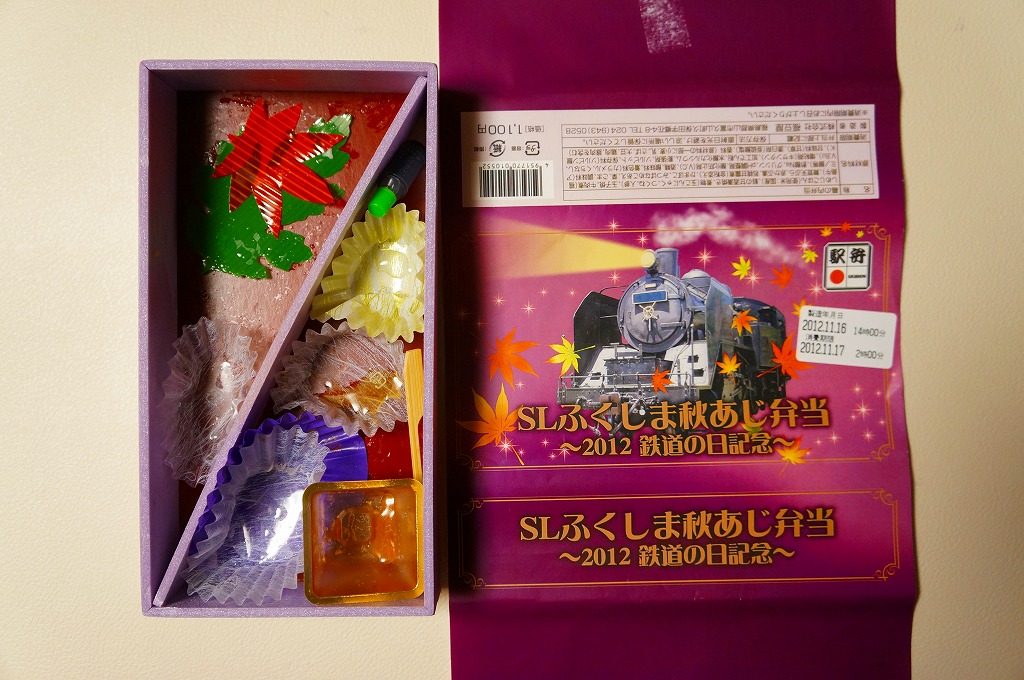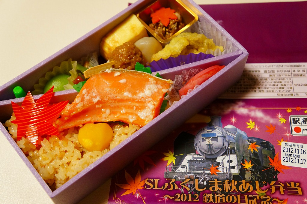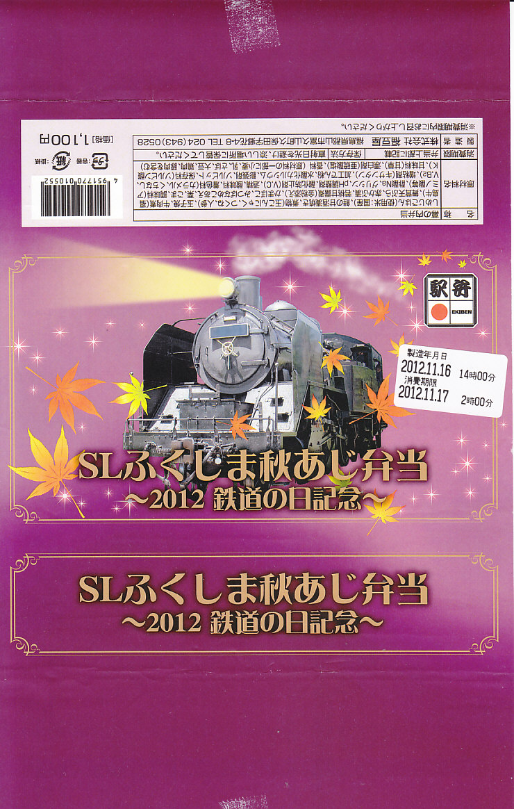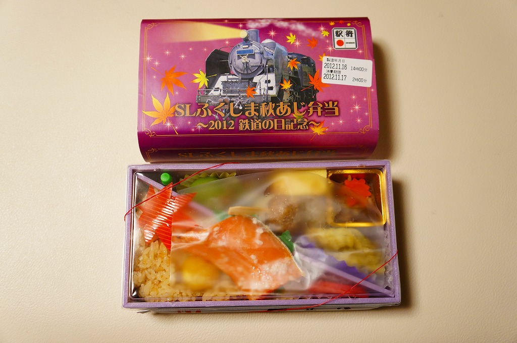 2012(平成24)年10月27,28日に只見線の会津若松駅と会津川口駅との間で運転された「SL只見線奥会津号」の運転に合わせて販売した郡山駅弁とされ、掛紙には10月14日の「2012鉄道の日記念」と書かれていたりするが、どうもこの商品は11月の東京駅の駅弁売店「駅弁屋 祭」と、翌年1月の京王百貨店の駅弁大会でしか売られていないのではと思われる。掛紙のSL写真(おそらくC11325)の正面ナンバープレートをなぜか塗りつぶしている点にも妖しさを感じる。