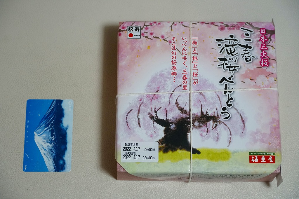 2006(平成18)年に発売。2月下旬から5月のゴールデンウィークの頃まで販売される、春限定の駅弁。駅弁の名前となる三春の滝桜が、大きめの容器を包む正方形の掛紙に大きく描かれる。中身は毎年同じではないようで、今回の2022年のものは、「里山ごはん」とする郡山米あさか舞コシヒカリの炊込飯にタケノコを並べ、こんにゃくやシイタケなどの煮物、玉子焼とサワラ塩麹焼とかまぼこの焼き物と漬物、鶏ささみ竜田揚、桃のシロップ煮、三色豆などのおかずを3列に収める。これは花見ができそうなお料理弁当。価格は2006年の発売時で1,200円、2011年から1,000円、2015年から1,050円、2020年から1,080円、2023年から1,100円、2025年から1,200円。