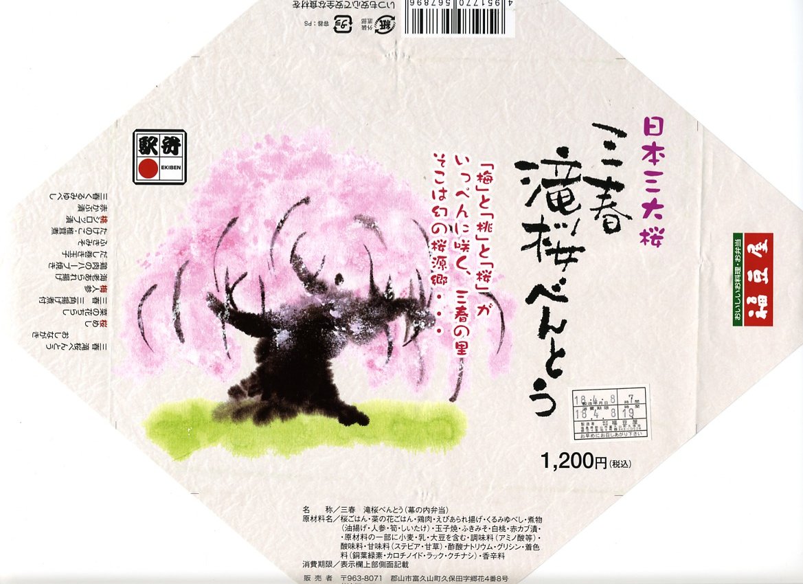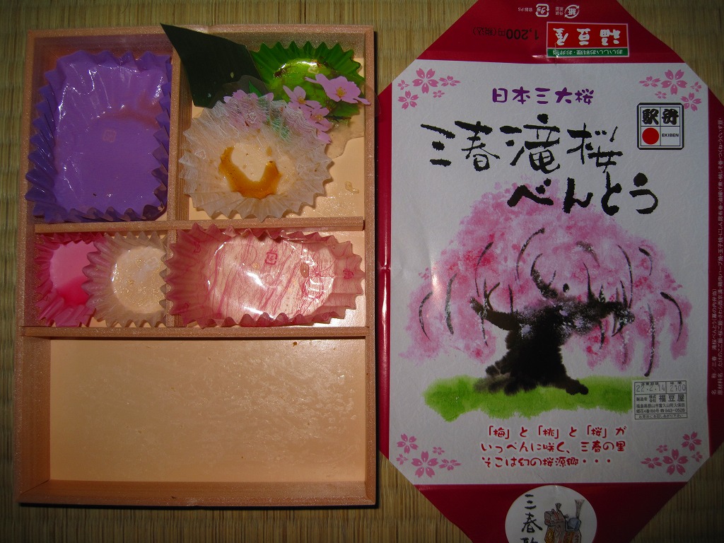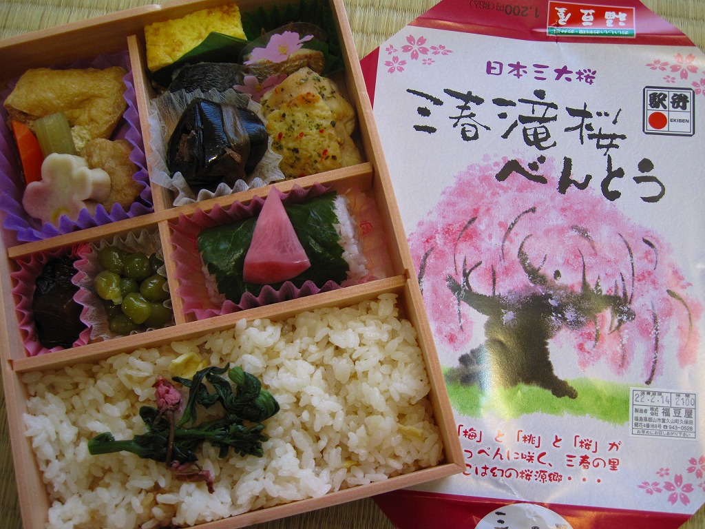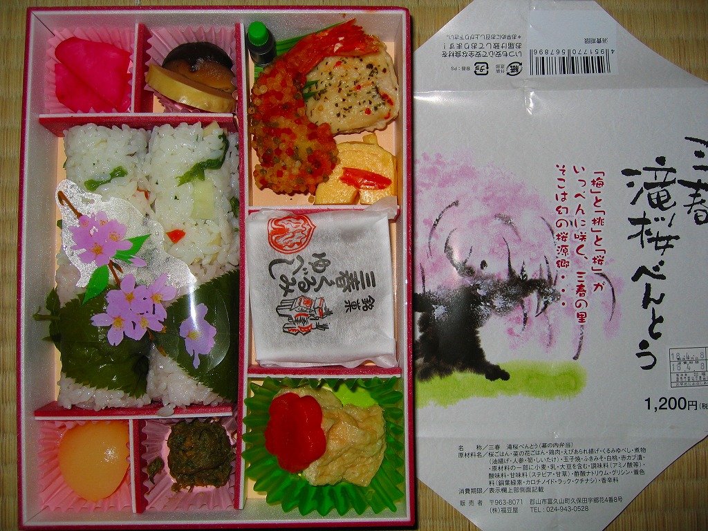 上記の駅弁「三春滝桜べんとう」の、2010(平成22)年時点での姿。タケノコ御飯と菜の花、桜めしと赤かぶ漬、玉子焼と鶏肉ハーブ焼とニシン昆布巻とサワラ西京焼にふきのとうみそ、鶏つくねとニンジンや三角揚げなどの煮物、桃しそ巻きにうぐいす豆などという中身であった。滝桜を使う掛紙の絵柄も異なる。当時はスーパーの駅弁大会での販売もあった。