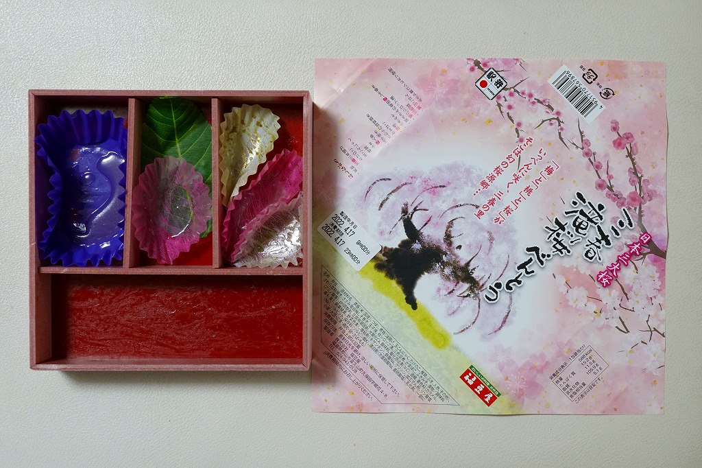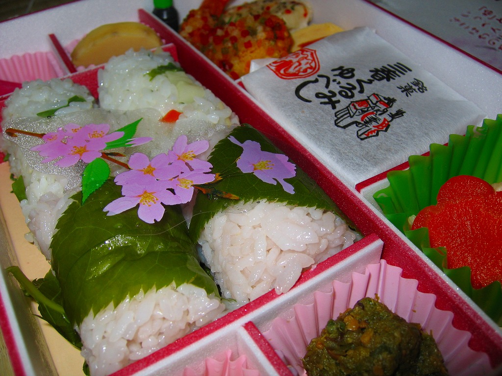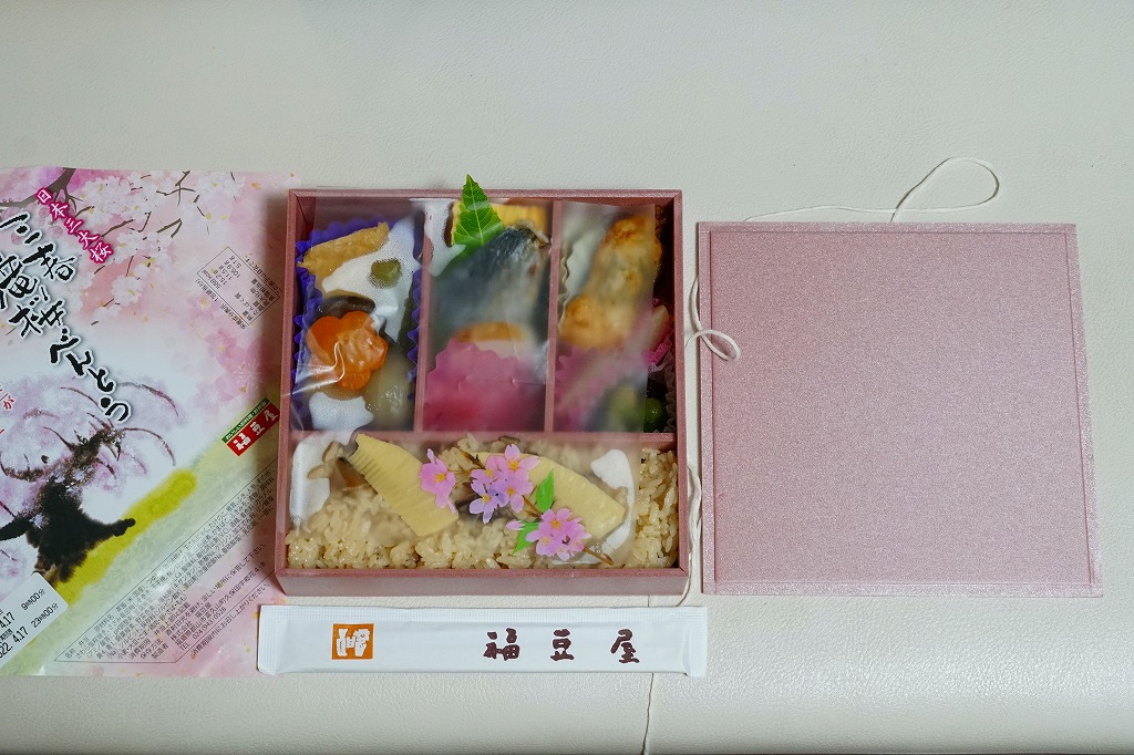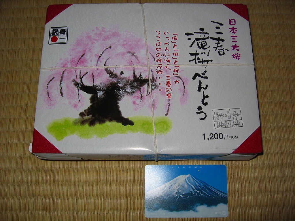 上記の駅弁「三春滝桜べんとう」の、2010(平成22)年時点での姿。タケノコ御飯と菜の花、桜めしと赤かぶ漬、玉子焼と鶏肉ハーブ焼とニシン昆布巻とサワラ西京焼にふきのとうみそ、鶏つくねとニンジンや三角揚げなどの煮物、桃しそ巻きにうぐいす豆などという中身であった。滝桜を使う掛紙の絵柄も異なる。当時はスーパーの駅弁大会での販売もあった。