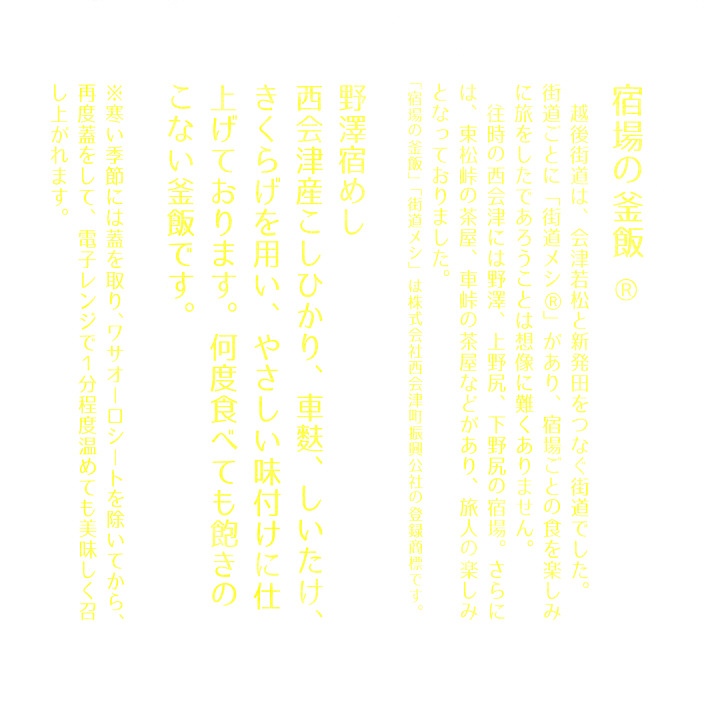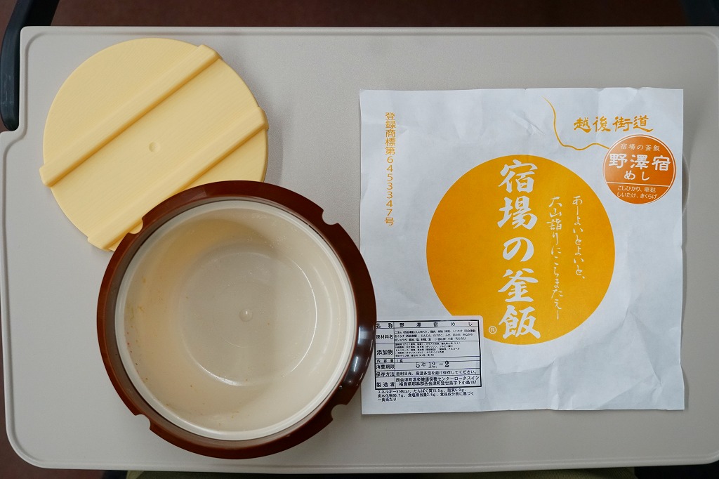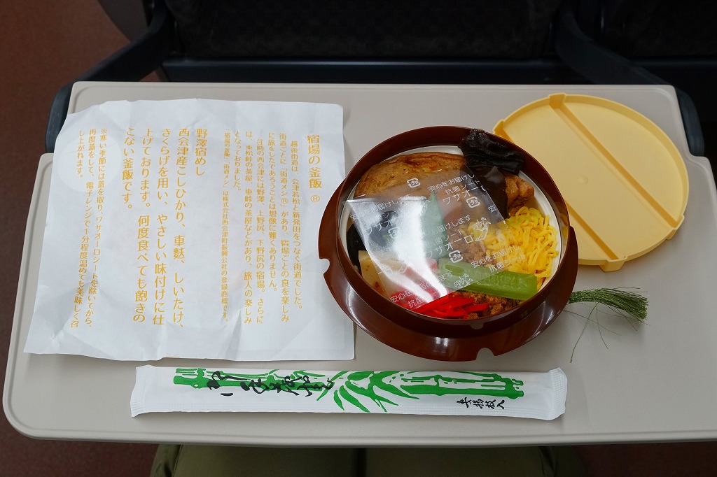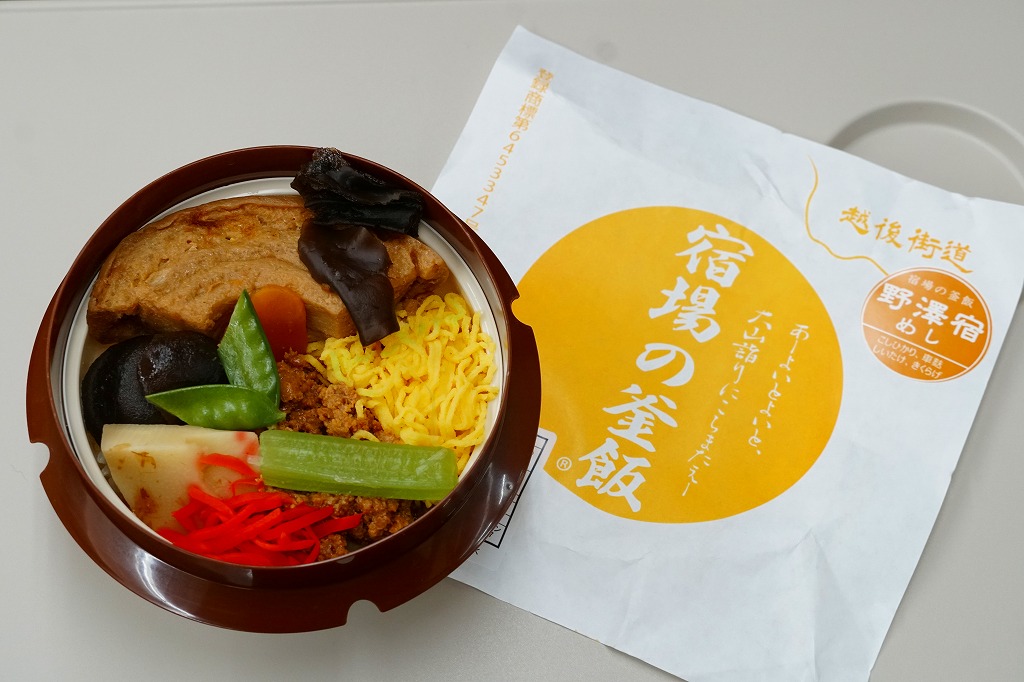 商品の名前は「野澤宿めし(のざわしゅくめし)」とも。2021(令和3)年5月のゴールデンウィークに、福島県耶麻郡西会津町野沢の「道の駅にしあいづ」で発売。6月19日から、磐越西線の観光列車「SLばんえつ物語」の運転日に、野沢駅のホーム上での販売を始めたという。調製元は西会津町の野沢駅の近くで温浴、宿泊、食堂などの観光施設を運営する第3セクター会社。