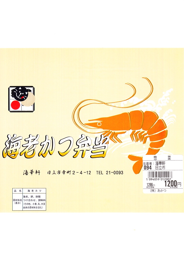 海老と商品名を描く赤基調の掛紙は、駅弁として駅で売られた当時のものが使われ、駅弁マークがシールで隠される。長方形のプラ容器に白飯を詰め、海老フライの卵とじを3尾も並べて覆い、ミニトマト、海藻、梅干しときゅうりとたくあんで3種の漬物を添える。プリプリのエビたっぷり、海老天丼にソースカツの衣を付けたような、卵とじで衣の味が柔らかく、モリモリ食べておいしいお弁当。