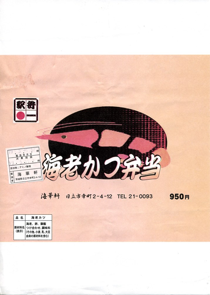 2007(平成19)年3月31日に購入した、日立駅弁の掛紙。いわき駅で購入。駅では買えなくなったが、上記の2023年のものと、値段と海老の本数が異なる以外は、おおむね変わらない。掛紙の絵柄も、基本的なところは変わらない。