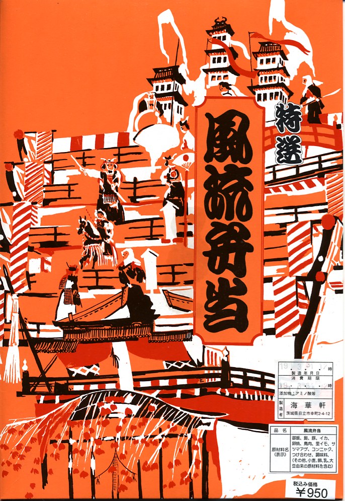 日立駅の幕の内駅弁。長方形のボール紙容器には、駅弁の名前の由来である、1959(昭和34)年に国の重要有形民俗文化財に指定された、神峰神社の大祭で使用する山車である日立風流物(ひたちふうりゅうもの)を描く。中身は日の丸御飯に小さな焼鮭や焼き鳥、イカフライに鶏唐揚にトンカツに玉子焼、薩摩揚、こんにゃく、里芋など。