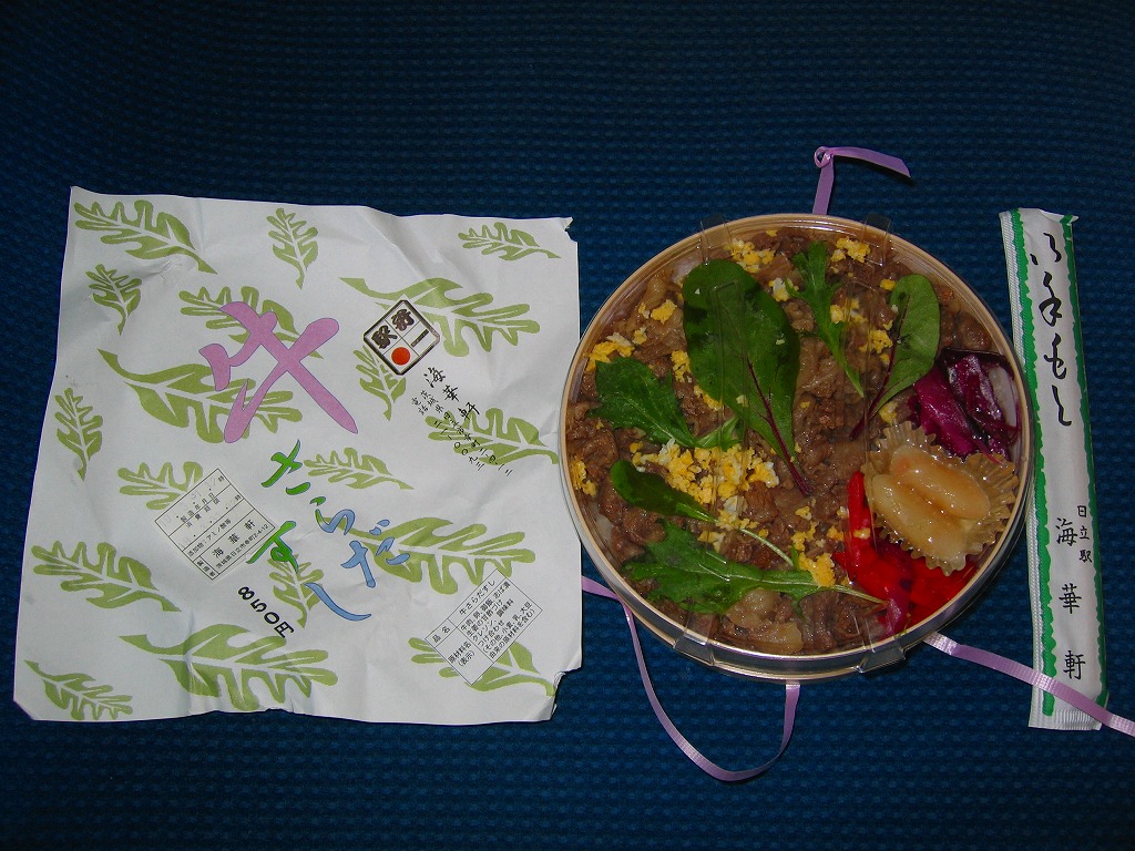 2005(平成17)年の夏までに発売か。上記の駅弁「ソースかつお弁当」と同じ、丸いプラ容器に酢飯を詰め、甘酢生姜を敷いて牛肉煮で覆い、炒り卵をまぶしてクレソンを貼り、紅生姜などを添える。個人的に肉寿司は好みでないが、これはテリの美しさや色彩の良さで見た目に優れ、おそらく個々の食材の品質及び組合せも優れ、しかも個性的。名前も分量も値段も良い感じ。