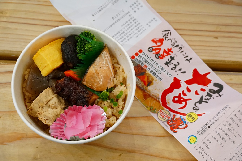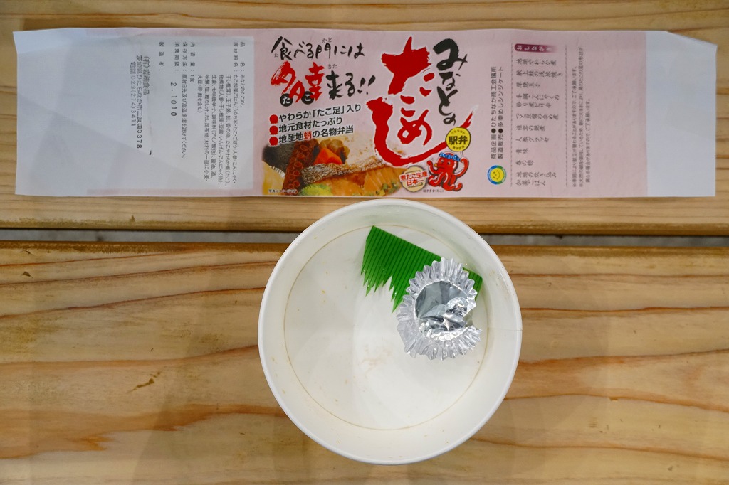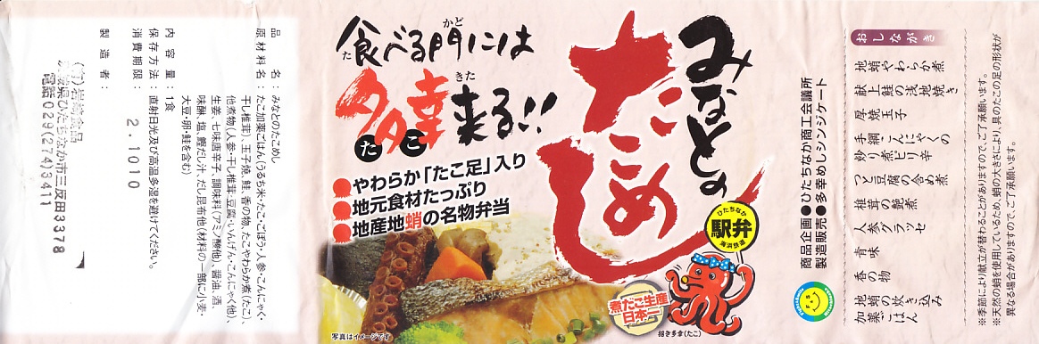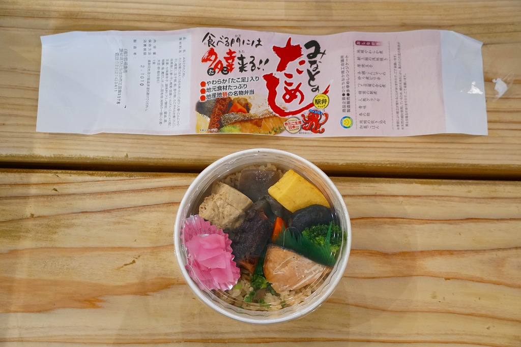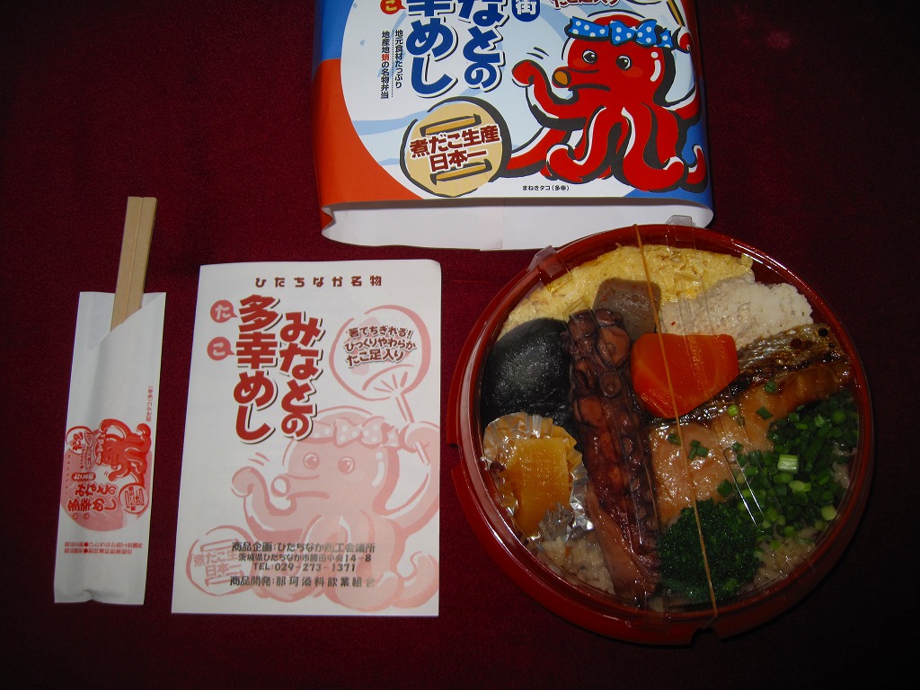 上記の弁当「みなとのたこめし」の、2011(平成23)年時点での姿。名前が「みなとの多幸めし」となっているが、よみがなは変わらない。タコ飯の中身も変わらない。当時はプラ製の釜型容器も各社で共用していた。この時も団体予約購入で、那珂湊駅で停車中の列車に持ってきてもらった。価格は2011年の購入時で800円、2018年時点で880円。