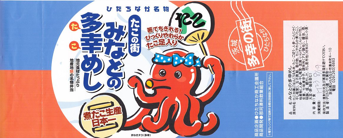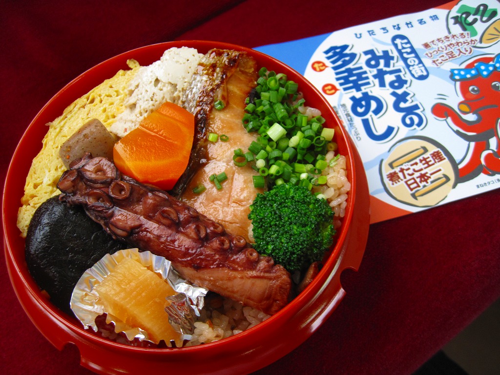 昭和30年代から三浜(さんぴん)地区(那珂湊+平磯+磯浜=現在の第三種漁港としての那珂湊の範囲)が日本一の生産地とされる煮ダコが主題。タコ足とその煮汁で炊き込んだ茨城県産米の御飯の上に、マダコあるいは季節によりミズダコの煮物や、地元の鮭、豆腐、野菜などを配置する。醤油も地元産のものを使う。掛紙や容器や、鮭と飯とタコを除く中身は一定していない。