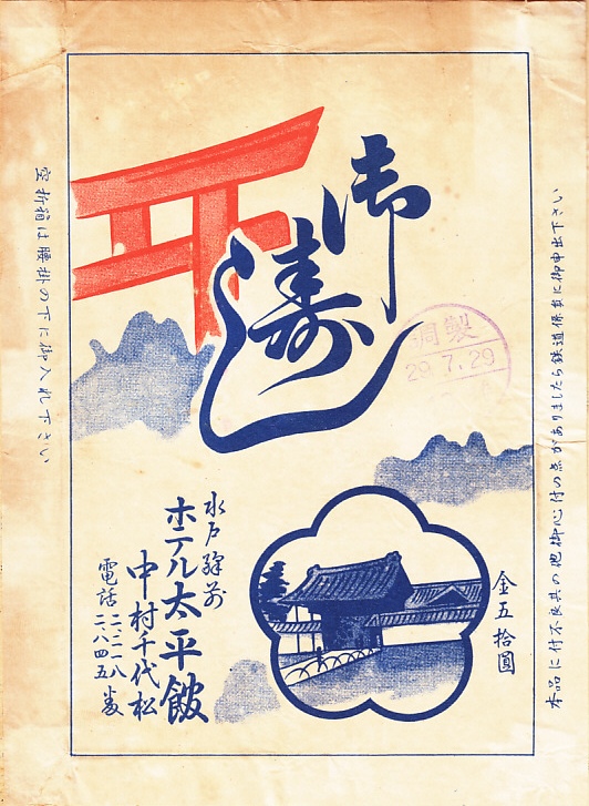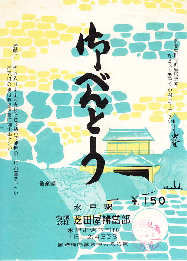 1960年代、昭和40年前後のものと思われる、昔の水戸駅弁の掛紙。水戸市の市内局番が1桁だったのは、どうも1965年頃から1966年頃までのようなので、その頃のものか。偕楽園の好文亭を描いたように見える。