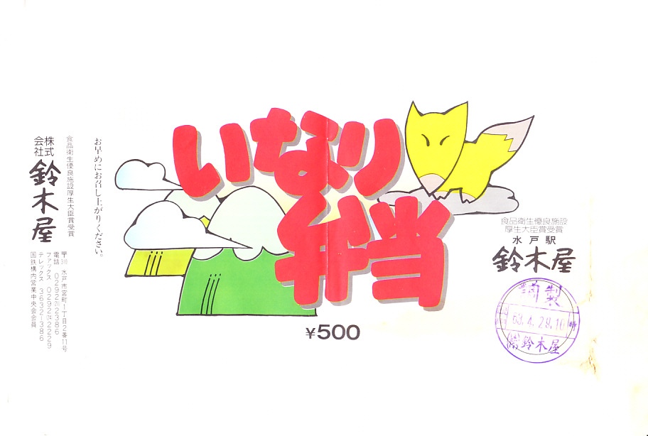 1988(昭和63)年4月29日10時の調製と思われる、昔の水戸駅弁の掛紙。当時の文具や原宿や清里などで流行した、ファンシーな文字と絵柄を持つと思う。
