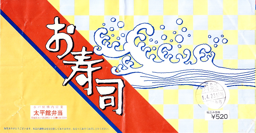 1989(平成元)年4月23日の調製と思われる、昔の水戸駅弁の掛紙。この月からの消費税の導入で、価格を520円に訂正して使用。中身はおそらく助六寿司。その掛紙にこんな波の絵柄を、なぜ使ったのだろうか。