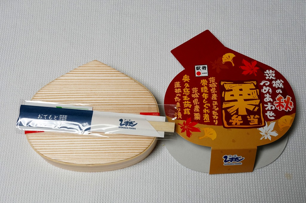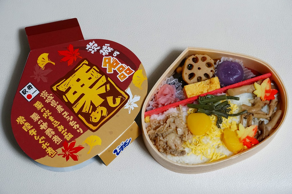 この容器に栗の炊き込みご飯を詰め、栗の甘露煮を載せ、常陸牛しぐれ煮とわらび漬けとしめじ煮と、紅葉型のかまぼこと錦糸卵も載せ、玉子焼、きんぴらごぼう、れんこん煮、一口昆布巻き、大根桜漬、くずもちを添える。形状も文字も栗だけど、御飯は真っ白なおこわに感じ、目に見える2個以外にクリはどこへあったのか。キャンペーンの紹介文に「茨城の秋の味をつめあわせた栗型のお弁当」とあったので、これは栗飯でなく栗の形のお弁当なのだろう。