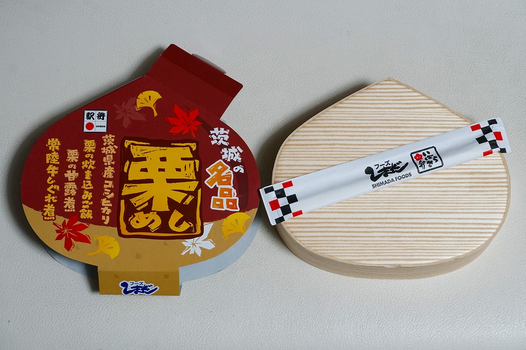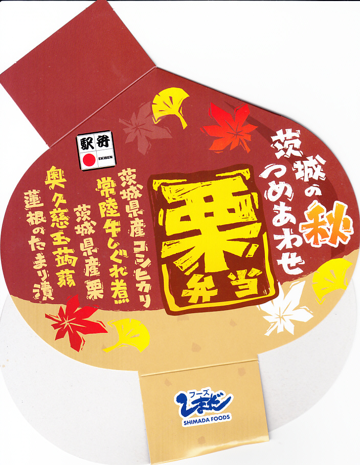 秋冬の駅弁大会シーズンに向けた、2023(令和5)年秋の新商品で、スーパーの駅弁大会で販売か。2024年10月からは水戸駅や東京駅で販売し、JR東日本の駅弁キャンペーン「駅弁味の陣2024」にエントリー。その姿は2018年の「茨城の秋つめあわせ栗弁当」にそっくり。中身は異なるようで、栗型の容器をぴったり覆うスリーブの文字に反映されている。