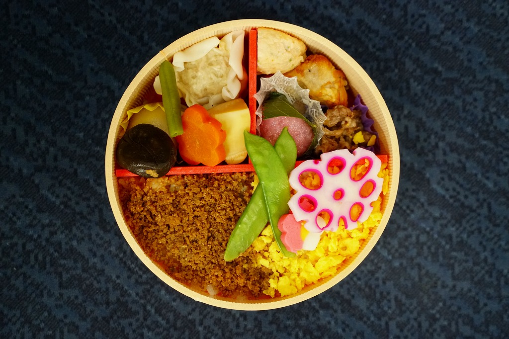見た目は四角い容器と掛紙から丸い容器とスリーブへ大きく変化。中身もだいぶ変わり、白飯を鶏そぼろと玉子そぼろで覆い、ローズポーク焼売、サクラエビの真丈、常陸牛しぐれ煮、ローストチキン、桜餅、煮物、花レンコンなどを詰めた。ファンが買うキャラクター駅弁なのに、手抜かりのない内容と分量と風味を備えている。