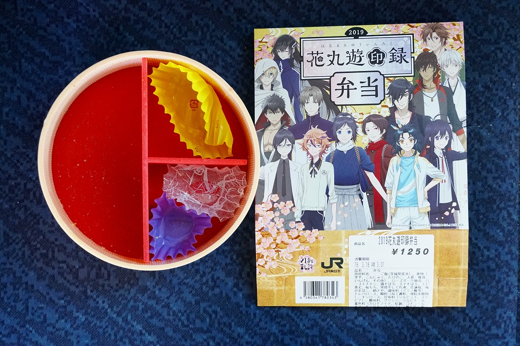 前年に続き、2019(平成31)年2月16日から3月24日まで、水戸駅と東京、品川、新宿、上野の各駅で販売。DMMのオンラインゲーム「刀剣乱舞」と、これを原作としたテレビアニメ「刀剣乱舞−花丸−」と、JR東日本水戸支社とのタイアップによる、偕楽園での「水戸の梅まつり」開催期間中に実施するスタンプラリーの期間中に販売された記念駅弁。スリーブの絵柄はもちろん、ゲームやアニメのキャラクターでできている。