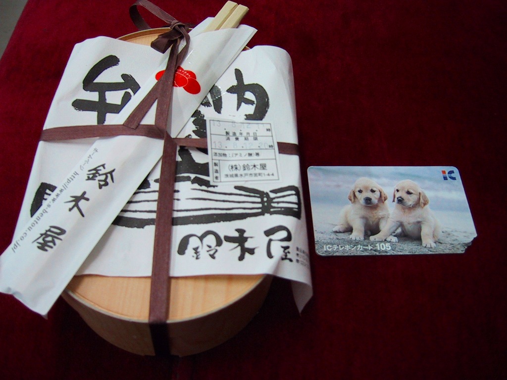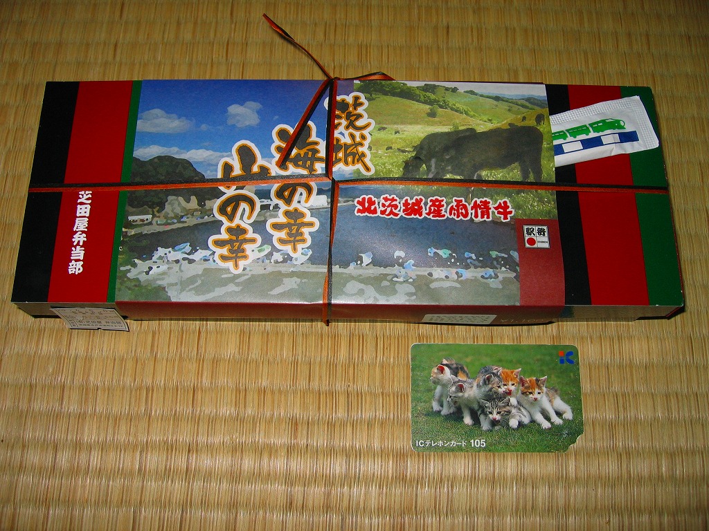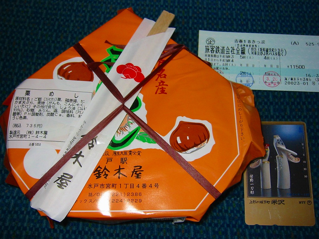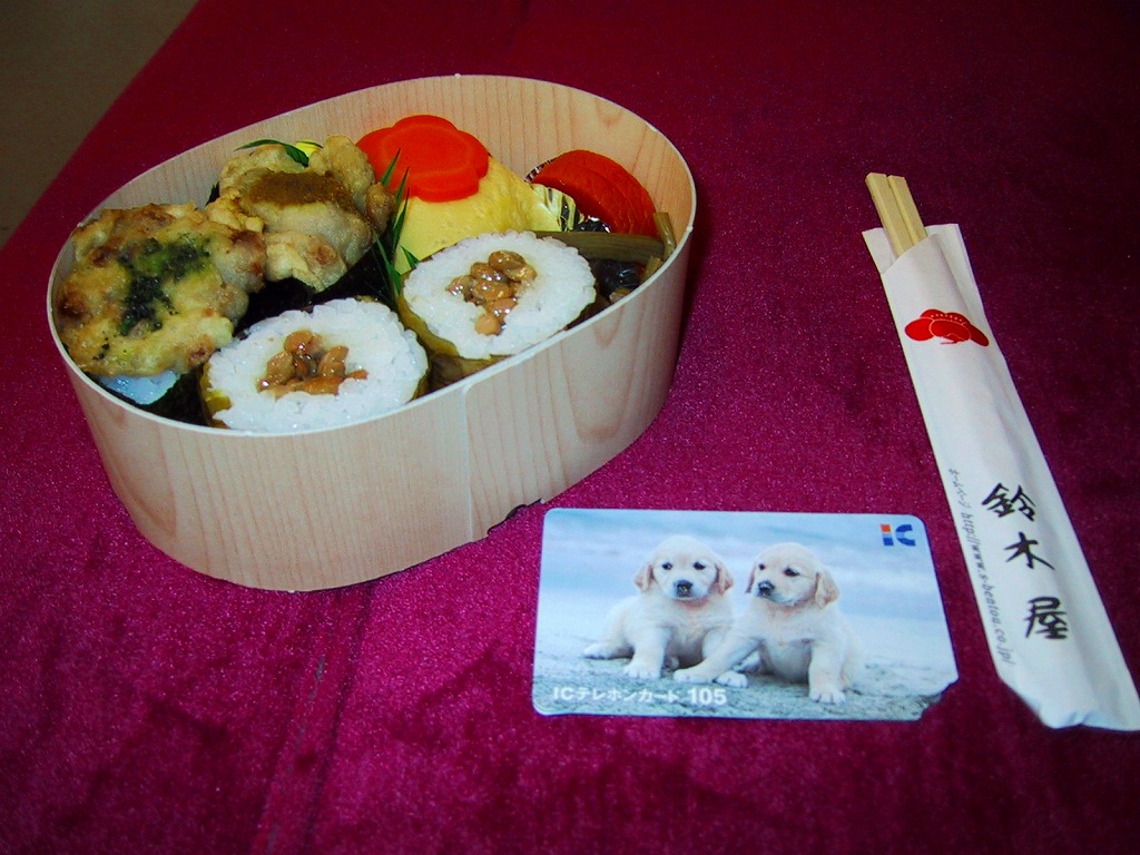 2001(平成13)年4月10日に発売。今までなぜなかったのかが不思議な、水戸納豆を題材にした駅弁。底が深い楕円形の木製風ボール紙製容器の中に、納豆の天ぷらの軍艦巻がふたつ、納豆の高葉巻のり巻がふたつ、納豆と挽肉の炒め物を卵で包んだ手まり寿司がひとつ、これで550円。容器は小ぶりながら安くて量があり、中身はまさに納豆づくし。味にキレもあり、納豆嫌いとあまり糸を引かない納豆を認めたくない方以外にはおすすめできる。