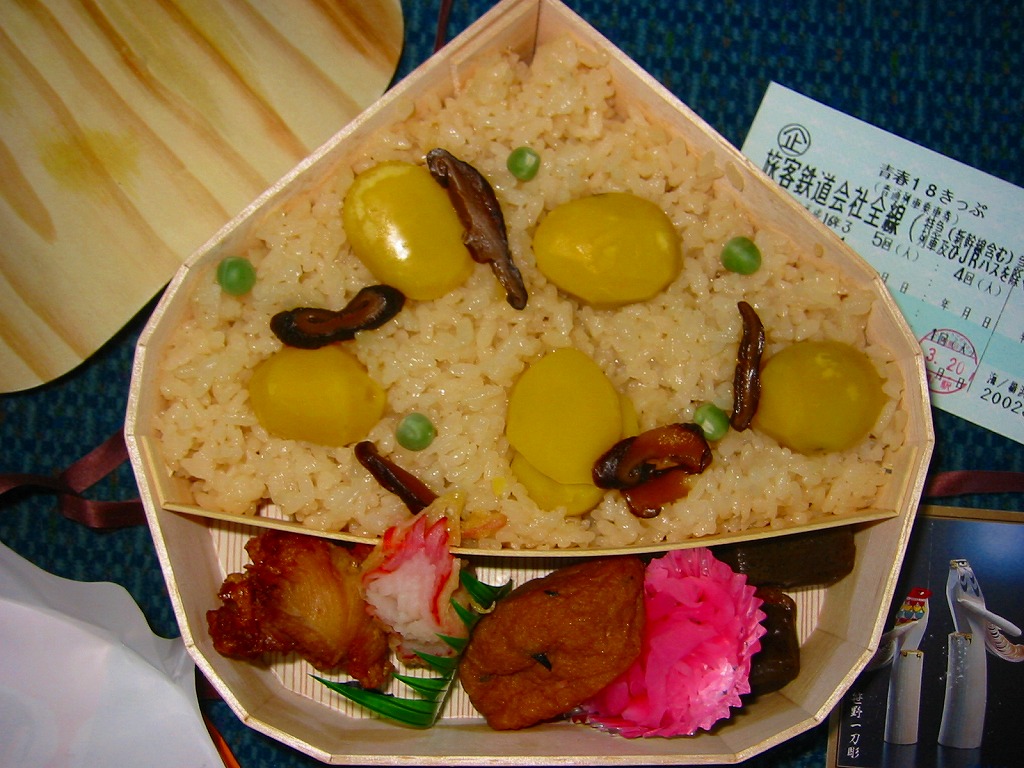 水戸駅の古風な栗飯駅弁。栗型容器は総経木製で、それを昭和レトロなデザインの掛紙で包み栗色の紙ひもでしばる。中身は椎茸と甘い栗が載った栗飯に、鶏唐揚やカニカマ天などを添える。かつて栗飯駅弁はその存在だけで有名になったようなのに、水戸の栗飯は無名で、つまり味はそんなもの。但しここまで古風に残ってくれているのなら、せめて食品表示のシールを掛紙でなく容器側面にでも貼り付けて、あと一歩の外観の演出が欲しかった。