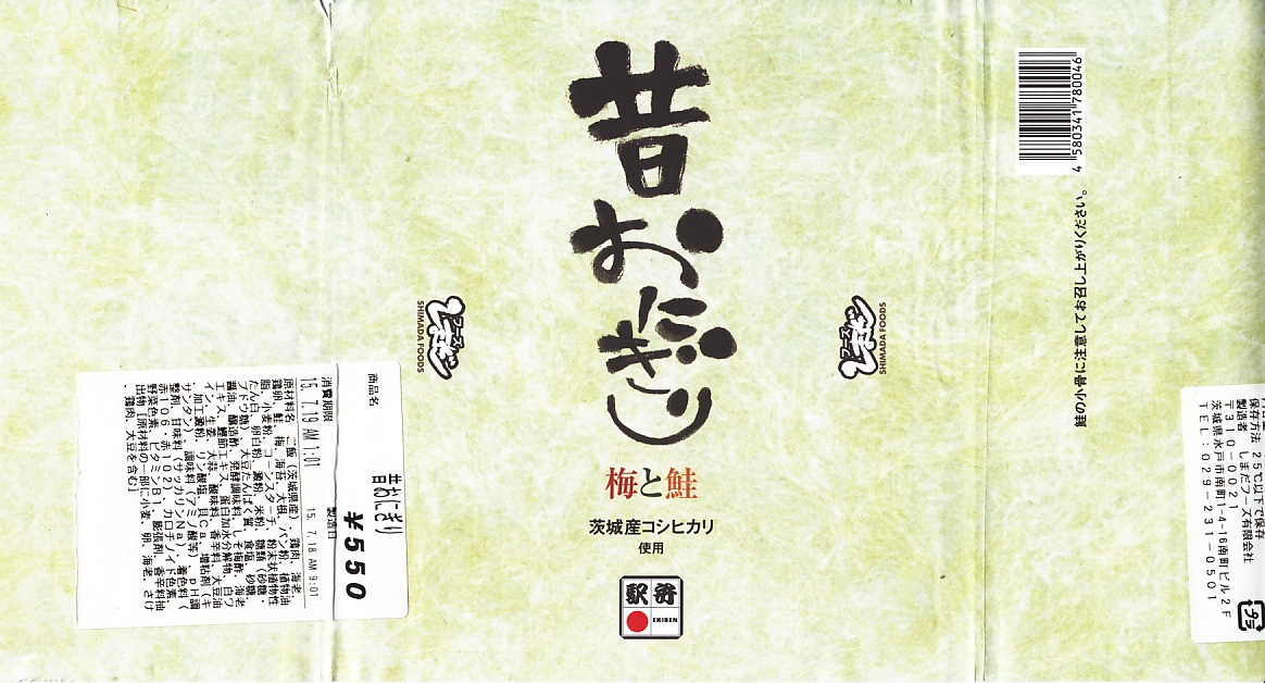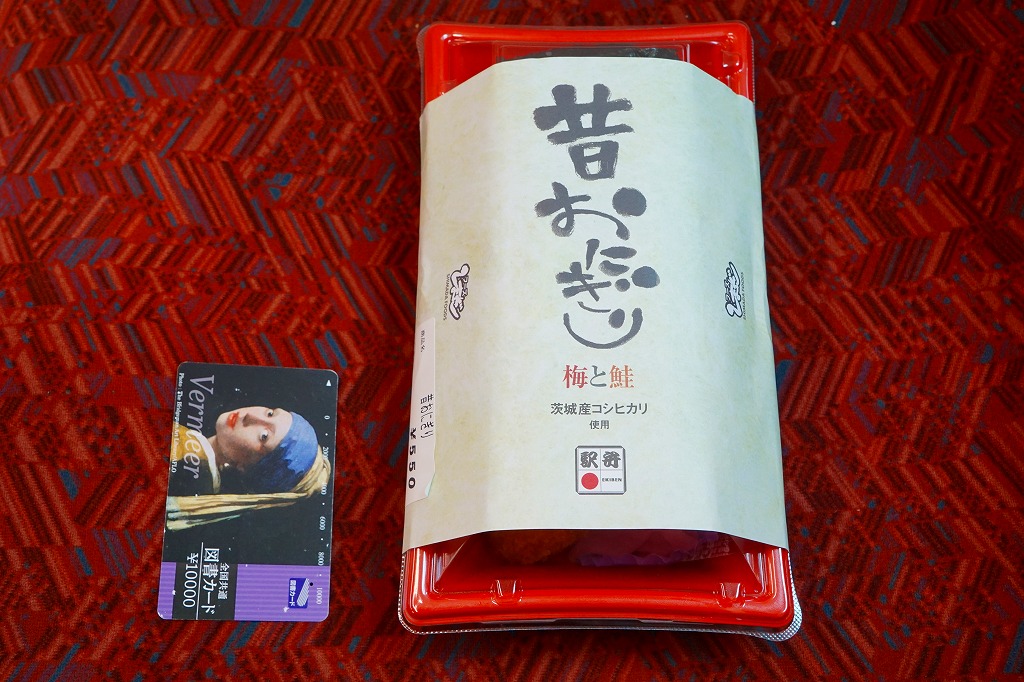 2011(平成23)年4月までに、水戸駅で発売か。この時に登場した4種の駅弁「常陸之國(ひたちのくに)美味紀行」(1,000円)「牛べん」(1,000円)「豚べん」(950円)「昔おにぎり」(500円)の一角。掛紙の文字で分かるとおり、茨城産コシヒカリを使う梅おにぎりと鮭おにぎりがひとつずつ入り、エビフライ、鶏唐揚、玉子焼、大根桜漬を添える。