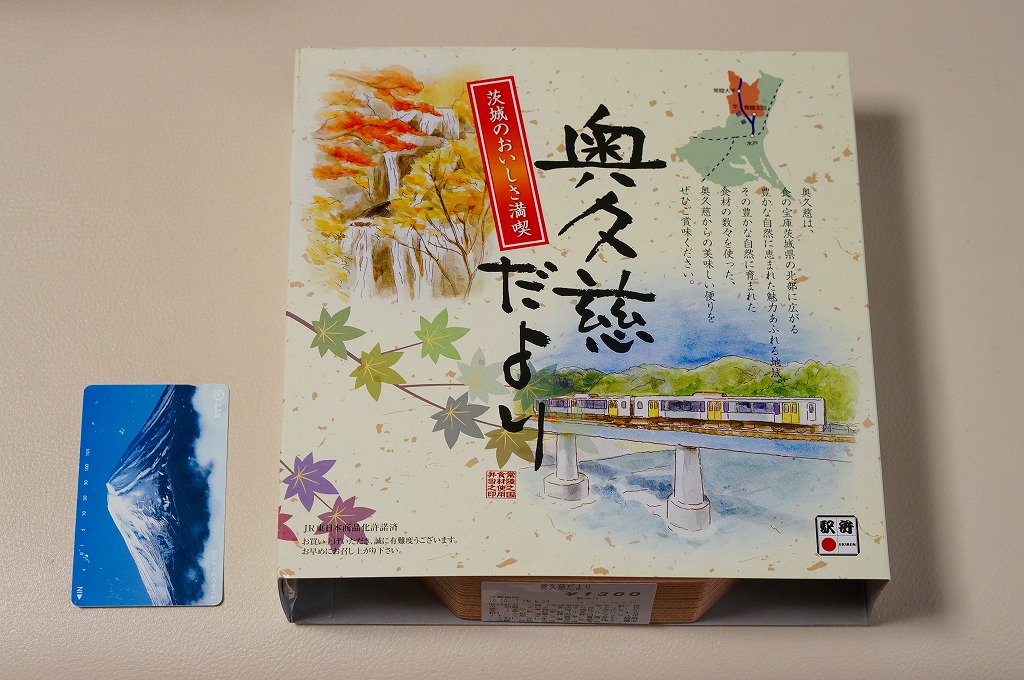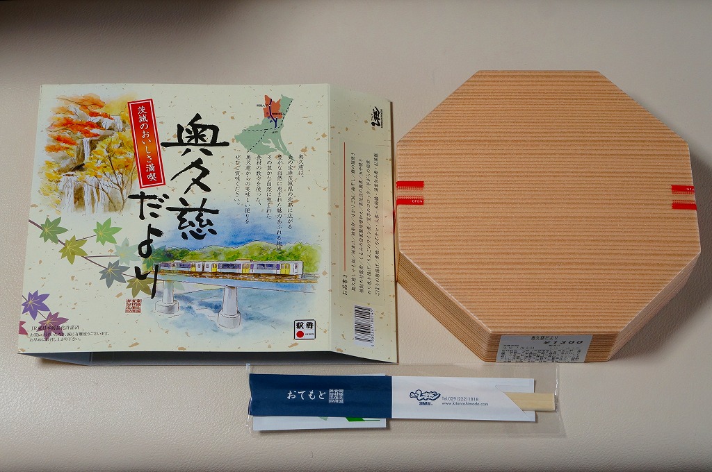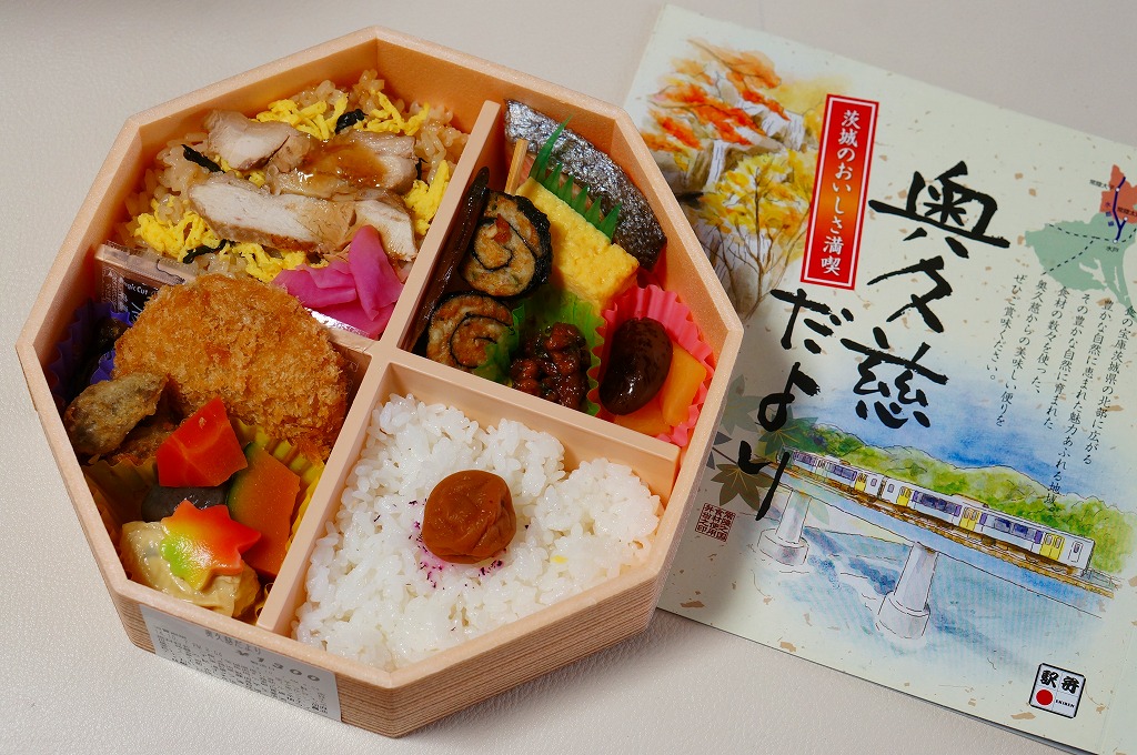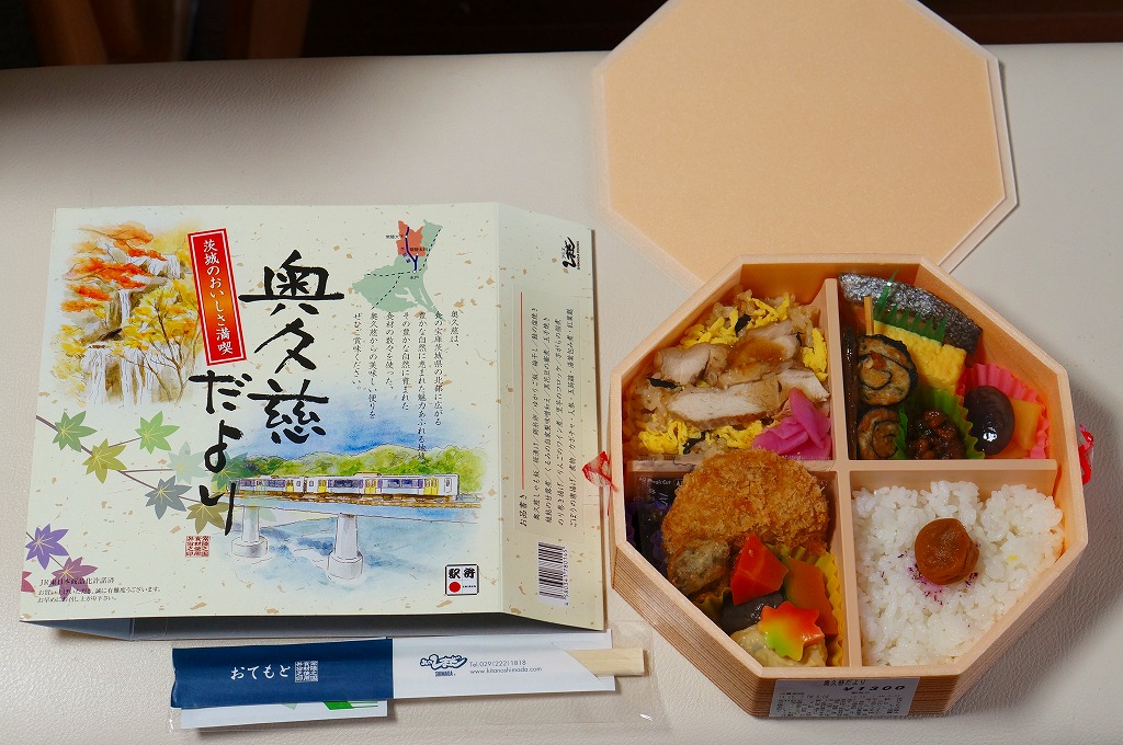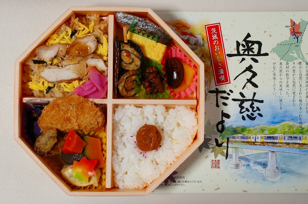 2012(平成24)年11月30日から12月2日まで「SL奥久慈清流ライン号記念弁当」の名で販売。翌2013(平成25)年10月に秋の駅弁「奥久慈だより」として再登場。正八角形の容器を4つに区切り、日の丸御飯、奥久慈しゃも飯、鮭塩焼とアユ甘露煮とクルミや黒豆やのり巻き揚げ、里芋コロッケやゴボウの唐揚げにゆばやカボチャなどの煮物と芋がら佃煮などを詰める。「茨城のおいしさ満喫」と書いてあり、これが茨城かどうかは洞察力を擁するが、おいしさは満喫できた。2014(平成26)年までの販売か。