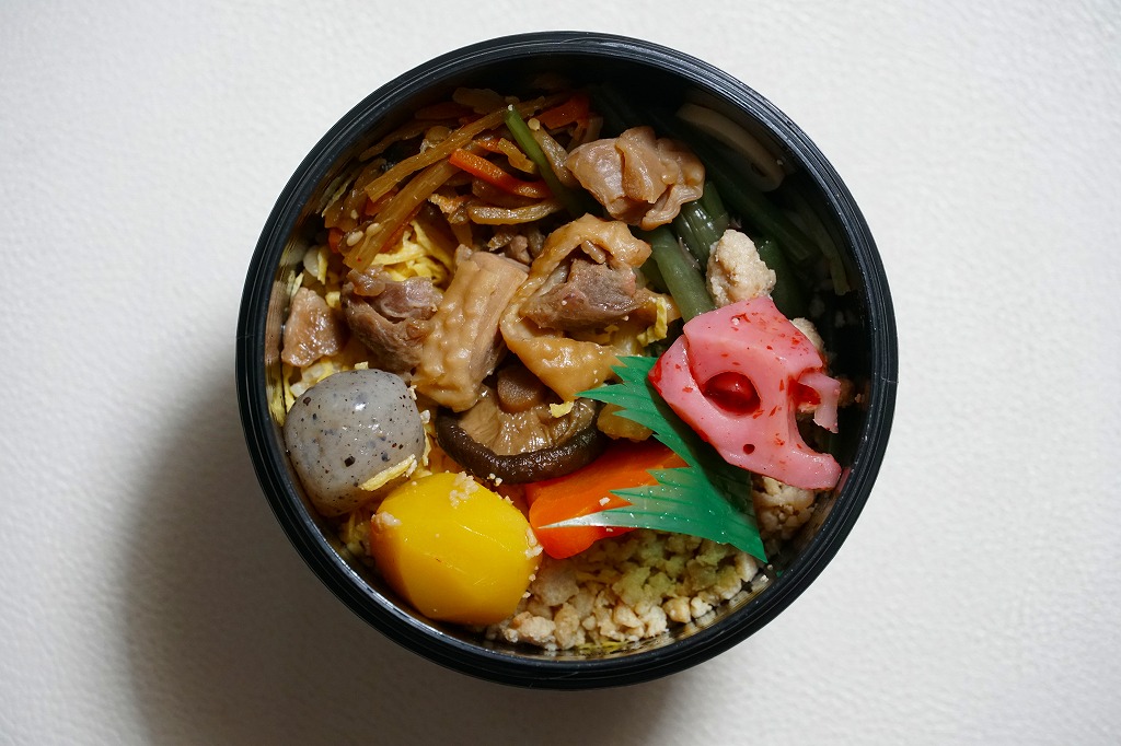 円筒形の真っ黒なプラ容器に炊込飯を詰め、シャモの煮物とそぼろ、きんぴらごぼう、山菜、栗、玉こんにゃく、れんこん、しいたけ、にんじんを散らす。つまり、しゃも弁当。水戸駅のシャモ駅弁はどうも、やはり、引き続き、固く無味で臭い肉になってしまい、味が乗ってこない。ふたにねじが切られて締め込めるため転用に便利そうな容器によるものか、1,580円という高額な駅弁になった。