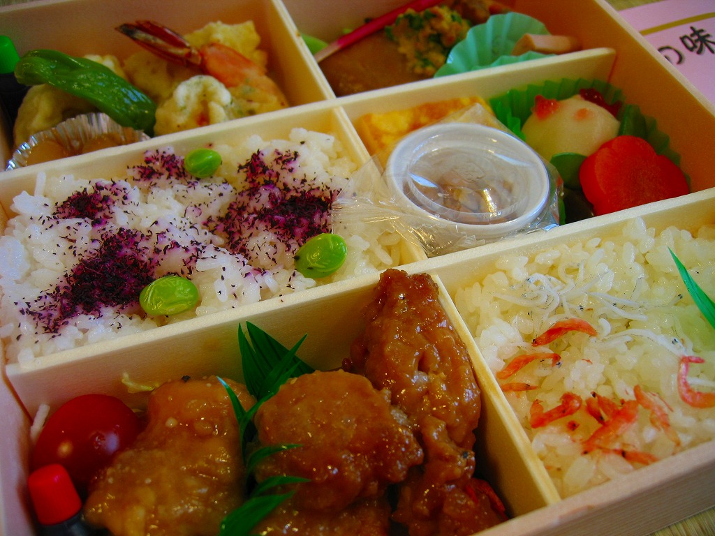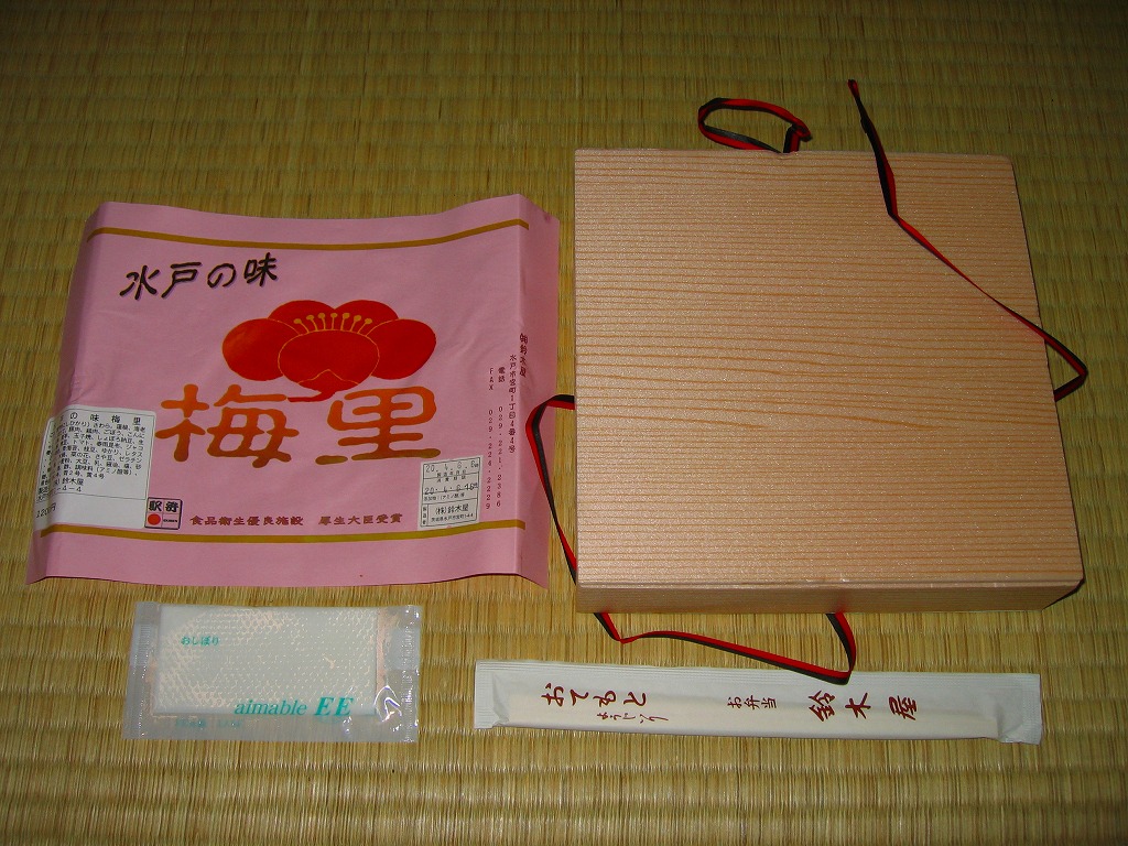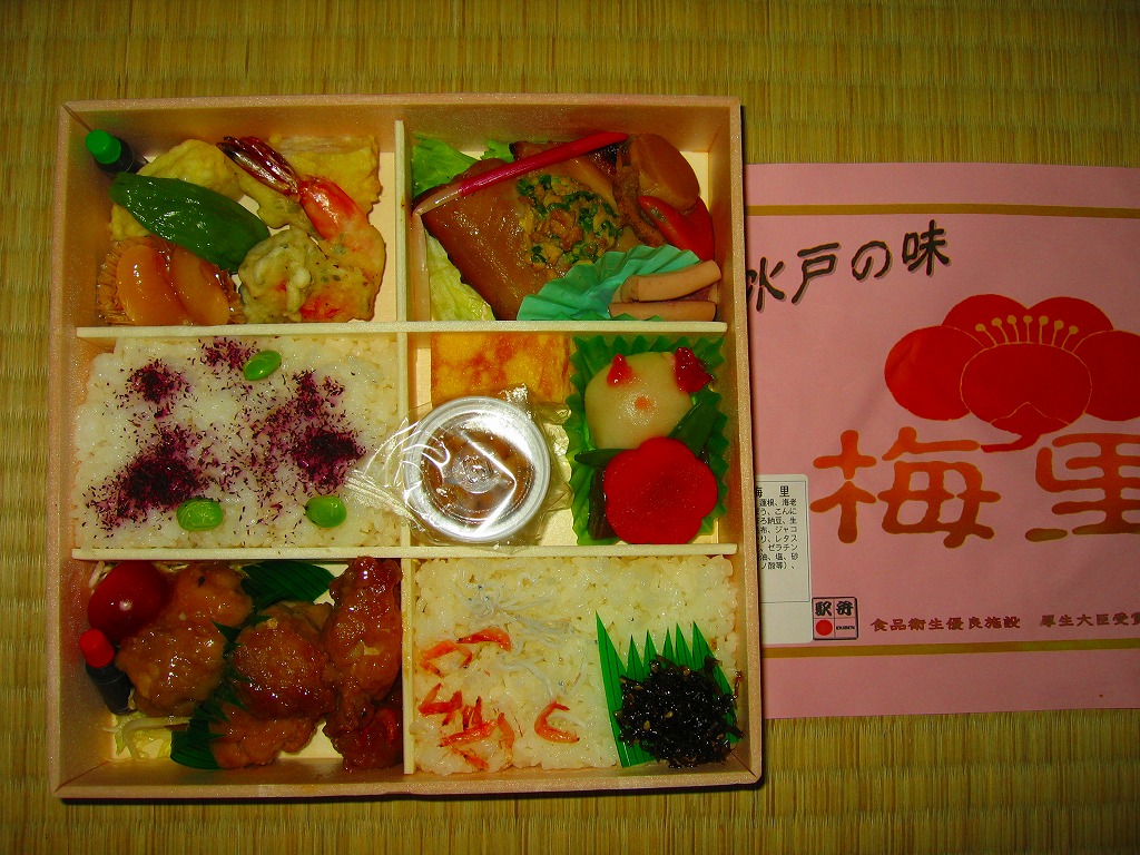 2008(平成20)年の水戸の梅まつり期間限定駅弁として、2月23日から3月31日まで発売、その後も販売継続中である模様。強度のない正方形の木目調容器に、ピンク色の用紙にインクジェットプリンタで駅弁の名前などを書いた掛紙をかけて、ひもで十字にしばる。6区画に収まる中身は、ゆかりをかけた白御飯、シラスとサクラエビを少々かけた白御飯、サワラとイカとホタテ、海老やレンコンなどの揚げ物、豚肉や鶏肉のあんかけ、ニンジンや里芋などの煮物と玉子焼に納豆カップ。