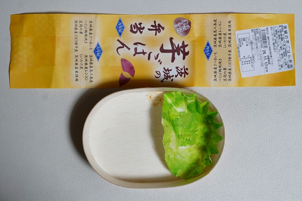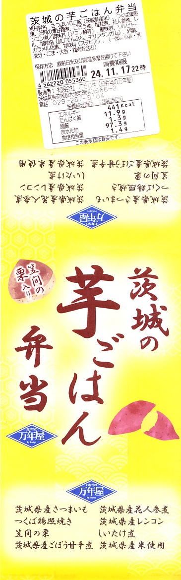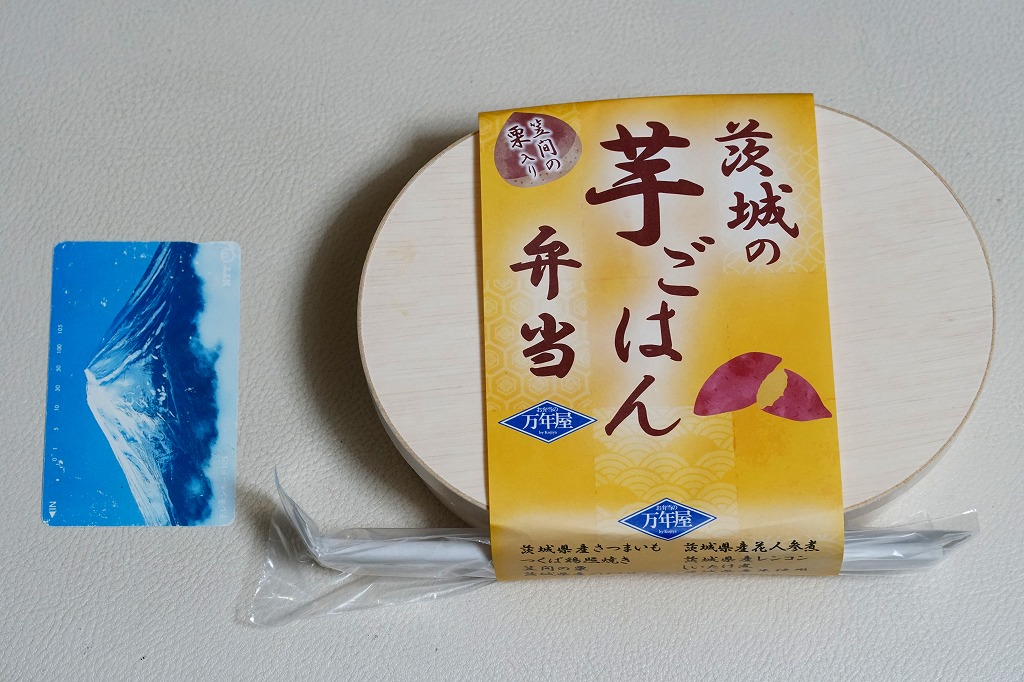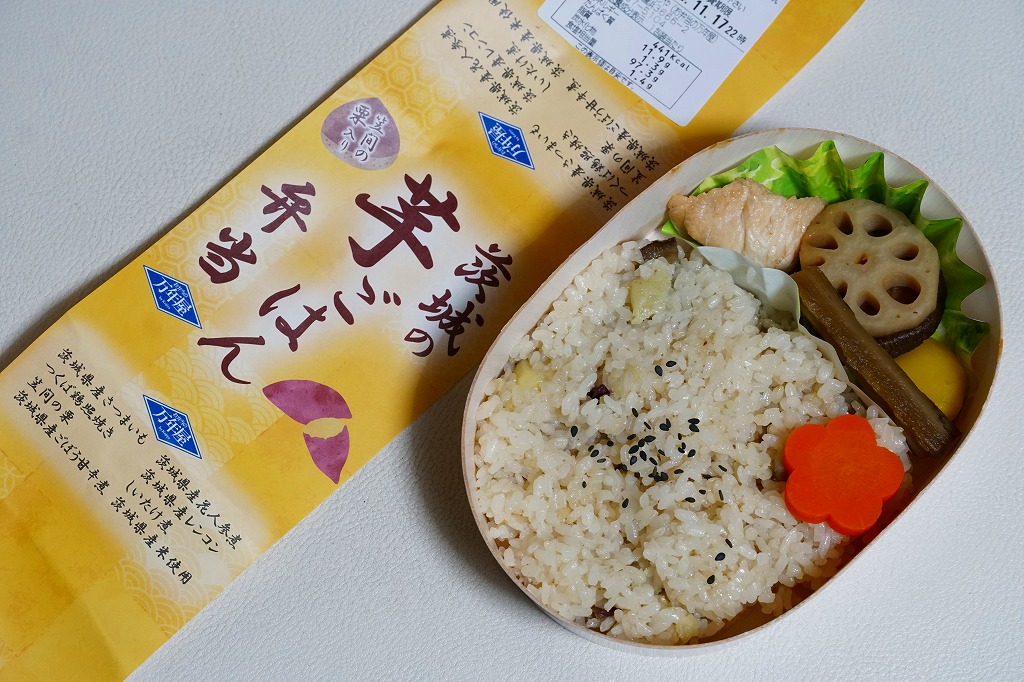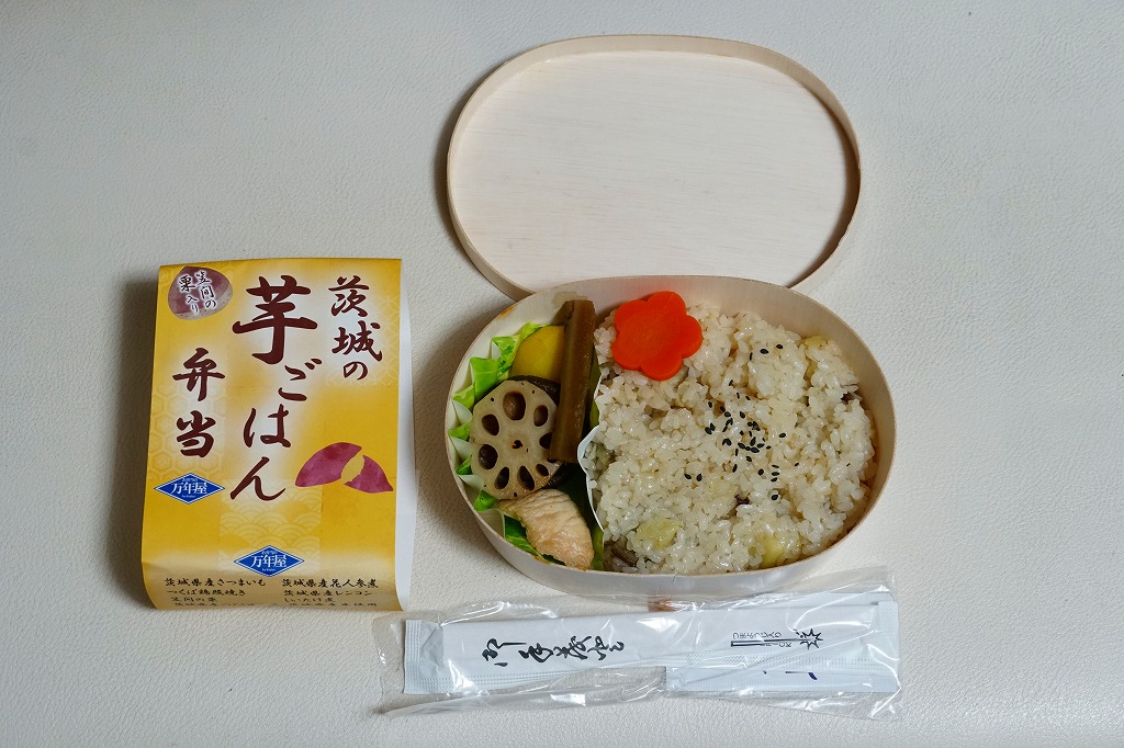 2024(令和6)年8月23日に水戸駅で発売。10月のJR東日本の駅弁キャンペーン「駅弁味の陣2024」にエントリー。商品名と色で芋を思わせる掛紙を巻いた、長円形の容器に茨城県産さつまいもの炊き込みご飯を詰め、茨城県産花人参煮、茨城県産ごぼう甘辛煮、笠間の栗、茨城県産れんこん、つくば鶏照焼、しいたけ煮を添える。おいもの甘さによりおかず要らずでいただける芋ごはんがおいしい。それに、酸味も辛味も苦味もないのがありがたい。サツマイモは薩摩芋というくらいなので鹿児島県が日本一の産地であるが、第2位は茨城県であり、シェアも3割強と3割弱であまり変わらないから、茨城の名物といって差し支えない。