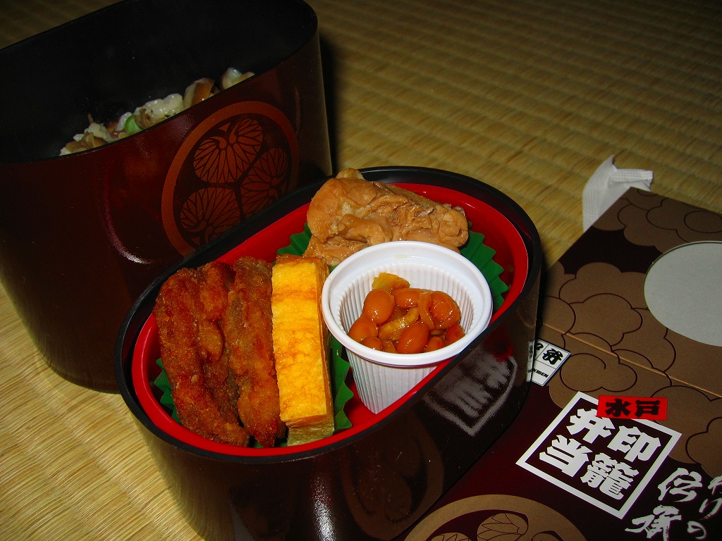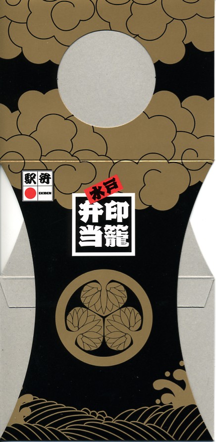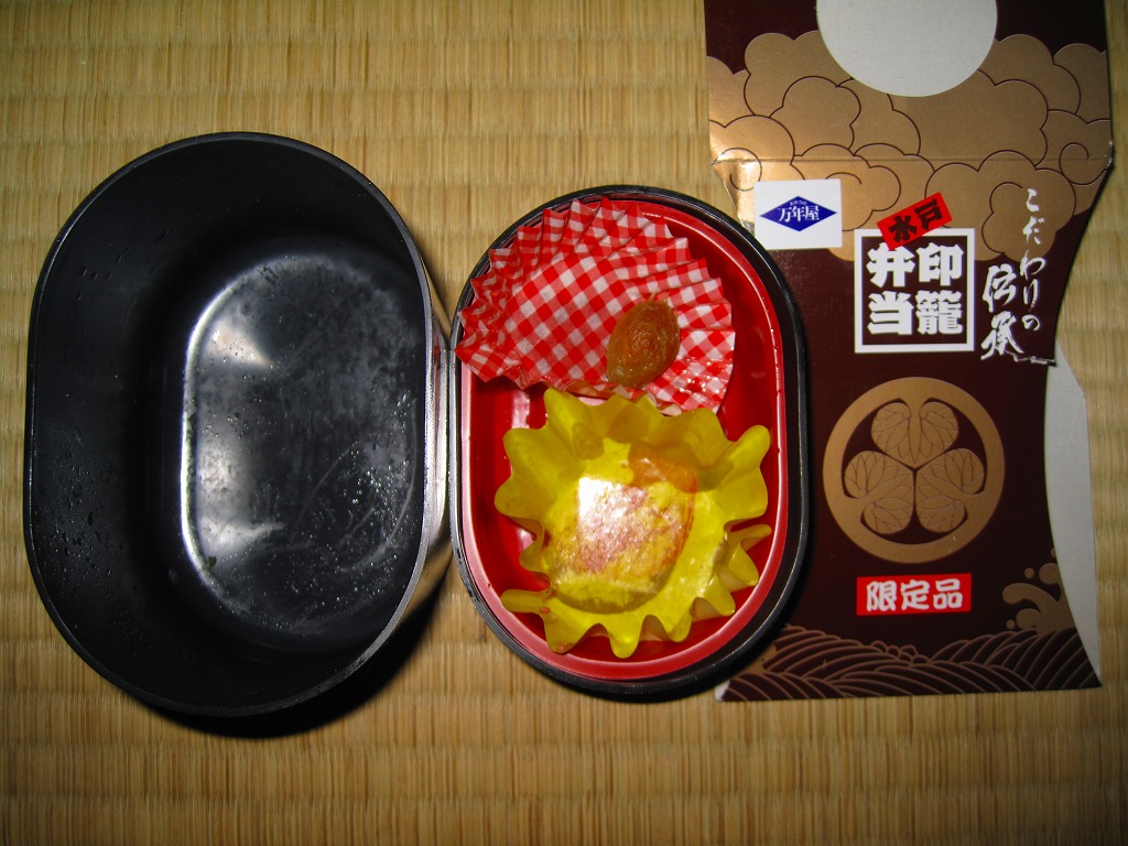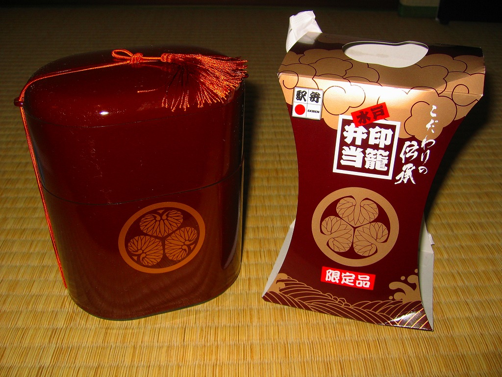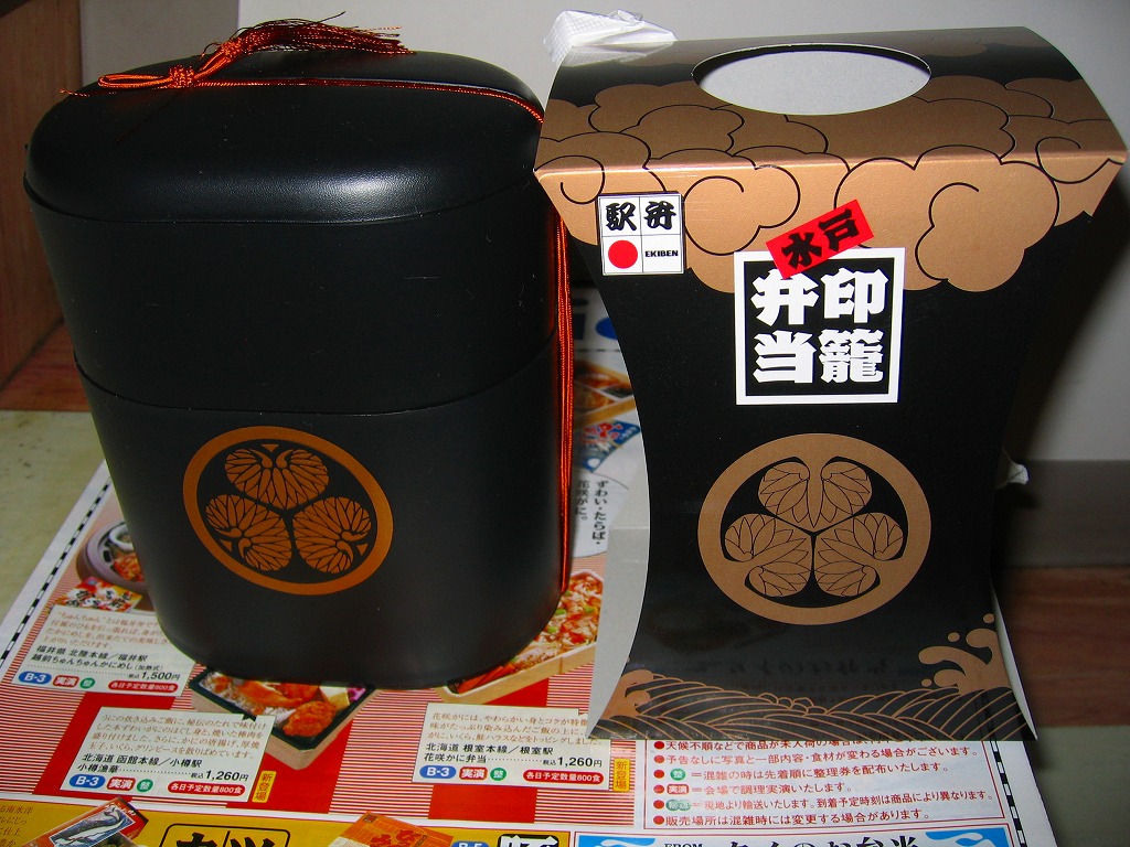 水戸駅の駅弁「印籠弁当」の、2001(平成13)年時点での姿。徳川家の葵の御紋と「水戸黄門」の文字を金色でプリントした、印籠の形を模した黒いプラ容器の、下段にじゃこ入り豆御飯、中段に椎茸やエビが載った手まり寿司が4つ、上段に角煮と煮物類を詰める。季節により変化する中身は、印籠〜携帯用薬箱〜健康という流れで、健康に良い食材で構成したという。おかず向けの食材が少ないとはいえ、淡泊で体に良さそうな味が出ている。2006年までに上記のとおり容器をリニューアル。