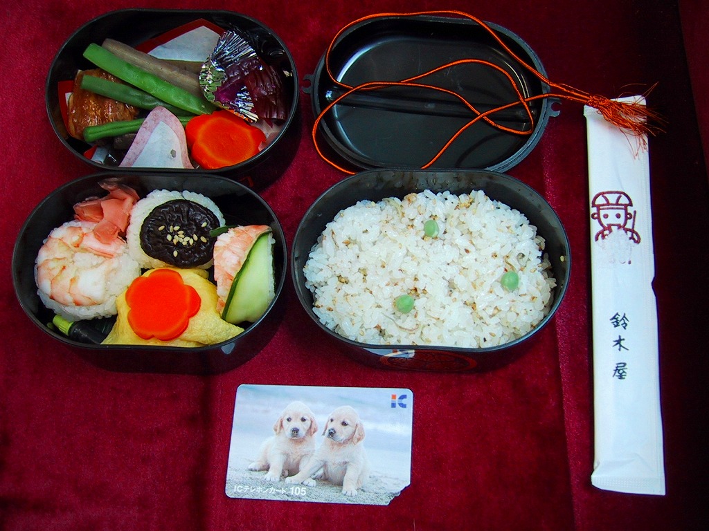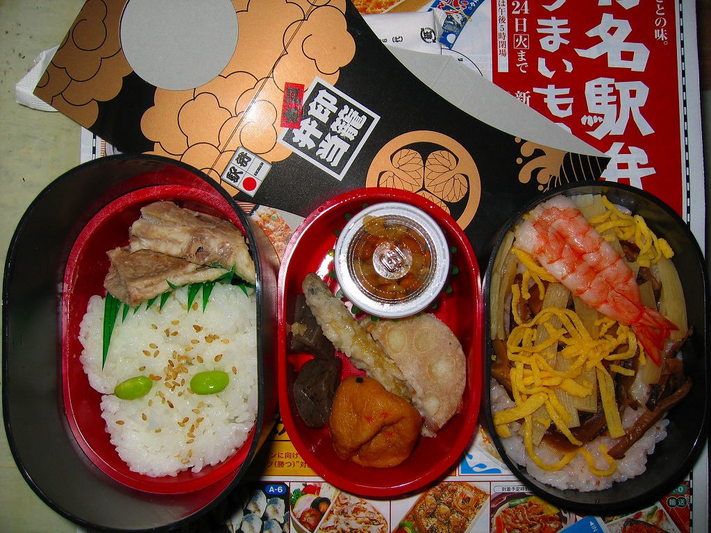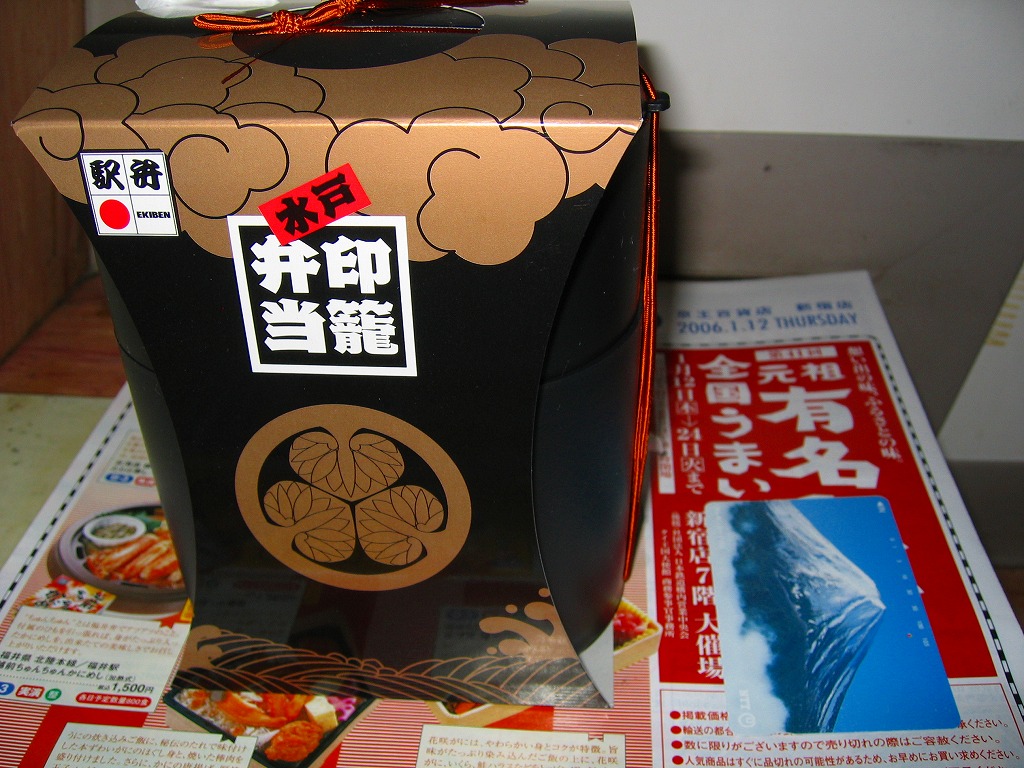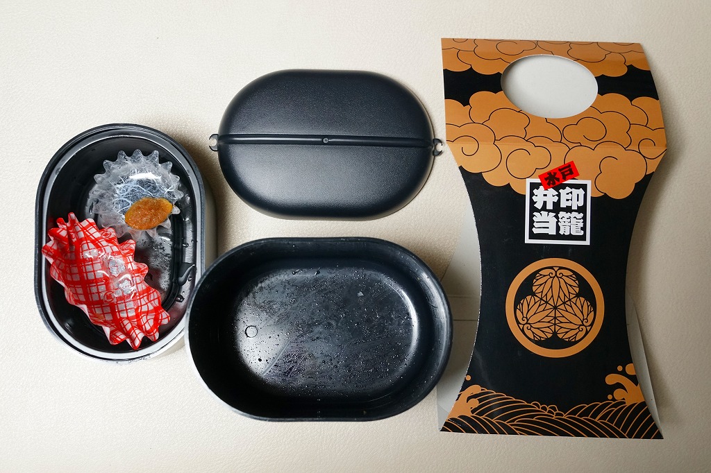 水戸駅の駅弁「印籠弁当」の、2001(平成13)年時点での姿。徳川家の葵の御紋と「水戸黄門」の文字を金色でプリントした、印籠の形を模した黒いプラ容器の、下段にじゃこ入り豆御飯、中段に椎茸やエビが載った手まり寿司が4つ、上段に角煮と煮物類を詰める。季節により変化する中身は、印籠〜携帯用薬箱〜健康という流れで、健康に良い食材で構成したという。おかず向けの食材が少ないとはいえ、淡泊で体に良さそうな味が出ている。2006年までに上記のとおり容器をリニューアル。