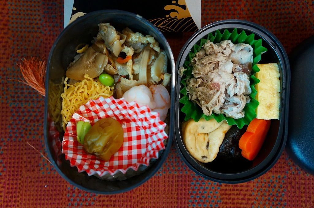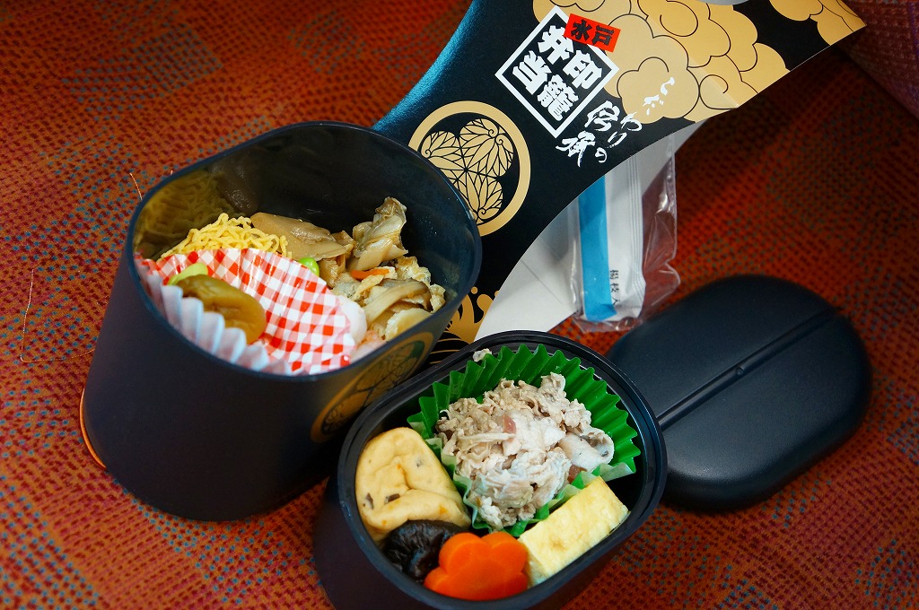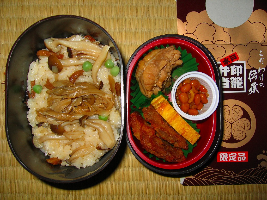 2006(平成18)年秋の新作。下記の駅弁「印籠弁当」の黒いプラ容器を、漆塗り風の赤黒い色に変更し、中身も3段分から2段に変更。下段に茨城産「黄門米」を使ったしめじと椎茸の炊込飯に舞茸を載せる御飯をたっぷり詰め、上段に鶏肉2点と豚肉、玉子焼き、カップ納豆を詰めた。