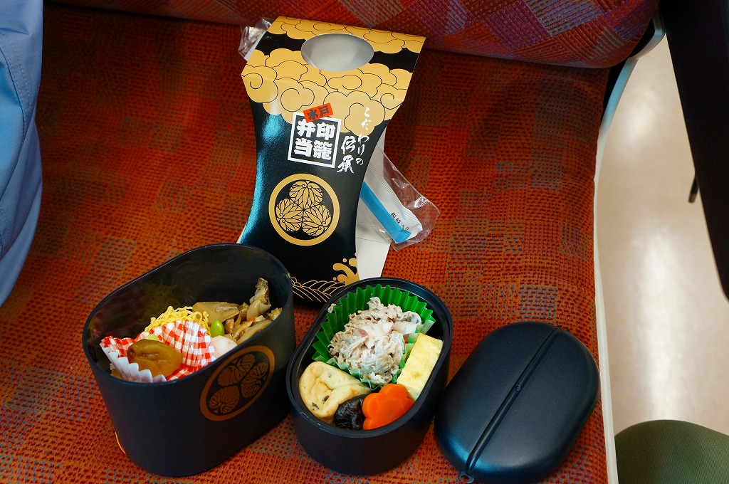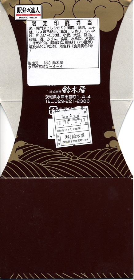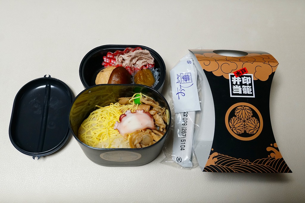 1995(平成7)年に水戸駅で発売。江戸時代の携帯薬箱であり、昭和時代を代表する人気のテレビドラマ「水戸黄門」における重要なアイテムであった印籠を、水戸で駅弁の容器にした。印籠の形状をイメージした黒い二段重ねのプラ製容器の、下段に炊込飯を詰めてハマグリ、タコ、錦糸卵で覆い、上段に豚肉、煮物、梅甘露煮を詰める。テレビドラマのレギュラー放送が終了したため、そろそろ水戸と印籠のつながりに説明を要しそうだが、今でもここにしかない形の駅弁として販売が続く。2010年の水戸駅弁の断絶を乗り越えた、唯一の駅弁である。価格は2010年の引き継ぎ時で大洗駅にて1,000円、2014年時点で1,080円、2023年時点で1,200円。