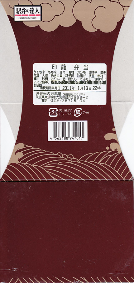 鹿島臨海鉄道の大洗駅で、2010(平成22)年中に発売か。水戸駅の駅弁屋の倒産により、同年1月13日限りで失われた有名な水戸駅弁「印籠弁当」について、外観つまり容器とスリーブがそのまま、大洗駅の駅弁屋に移籍していた。中身はまったく変わり、下段で炊込飯の上に錦糸卵、エビ、貝、青梅の甘露煮などを載せ、上段で梅肉入り豚しゃぶ、玉子焼、シイタケ、ニンジン、がんもどきを詰めていた。