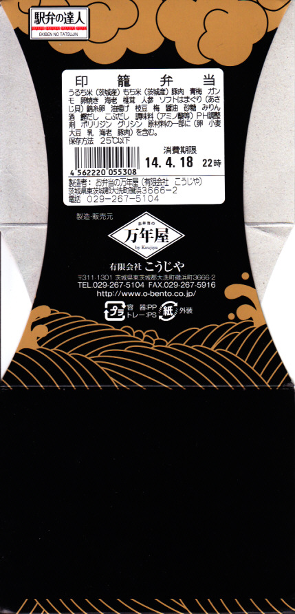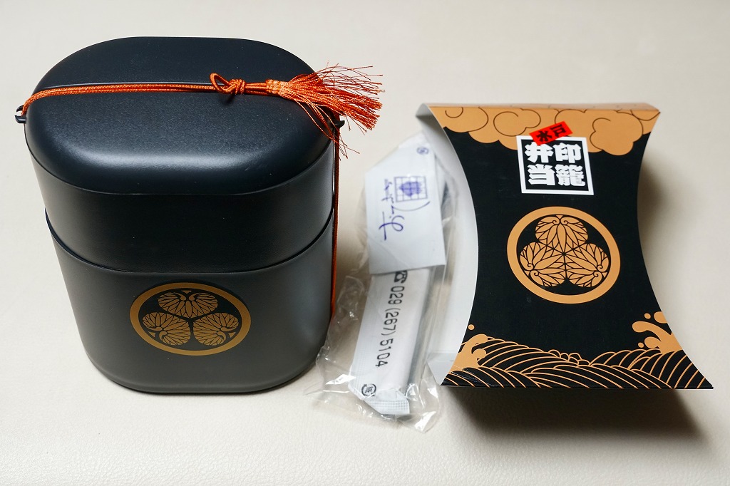 上記の駅弁「印籠弁当」の、2014(平成26)年時点での姿。5年後と容器も内容も値段も変わらないように見えて、中身の詰め方が異なるので、まるでリニューアルでもかけたかのように見える。容器の色は黒に戻り、2013(平成25)年10月に水戸駅での販売が3年8か月ぶりに再開された。