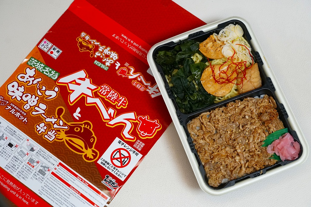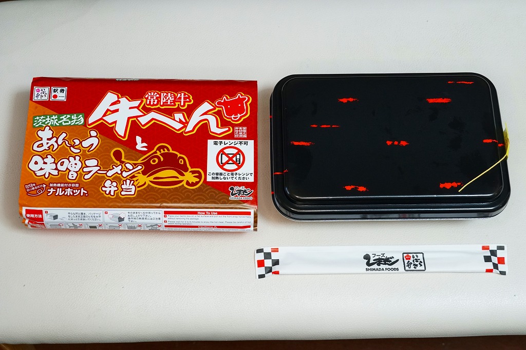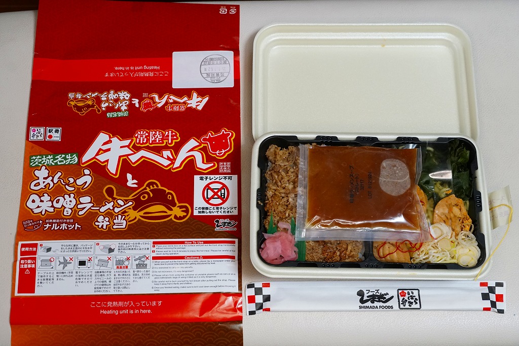 2025(令和6)年1月の京王百貨店の駅弁大会で、出水駅の駅弁として実演販売。今回の催事場で出水駅「鹿児島黒豚炙り焼豚ラーメンとまかない角煮めし」と新千歳空港駅「駅めん吉山商店×美食千歳」との「よくばりコラボ!駅弁×ご当地ラーメン」企画を担った。商品名に牛とアンコウのイラストを記した赤い掛紙を巻く、長方形の加熱機能付き容器に、白飯を詰めて常陸牛のしぐれ煮と白ごまで覆い大根桜漬を添え、ラーメンを詰めてアンコウの味噌煮、あんきも(アンコウの肝)煮、わかめ、ねぎ、糸唐辛子で覆う。ラーメンのスープを添付。駅弁にしてよかったためしがないと思うラーメンは、水戸駅弁「あんこう三昧弁当」の具で補われ、水戸駅弁のスタートアップ「常陸牛牛べん」も詰めて、これならば悪くない。この大会でのみの販売か。