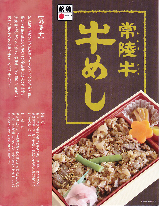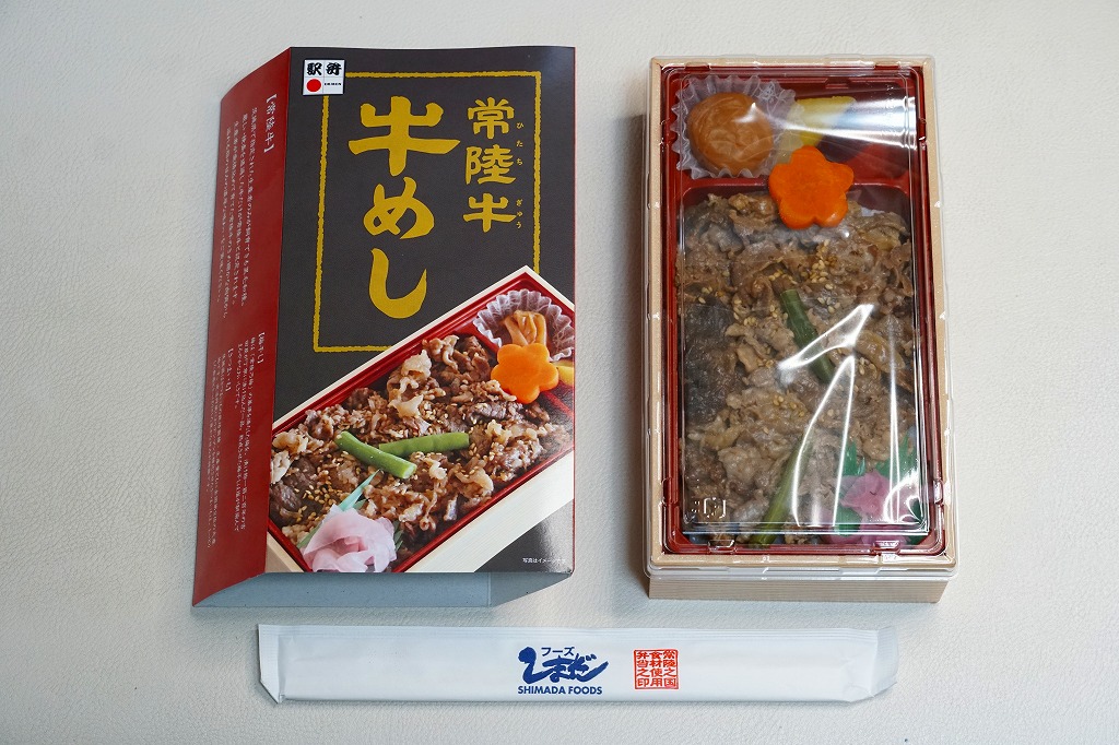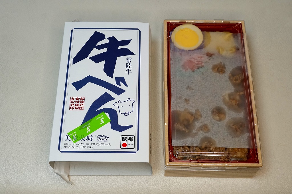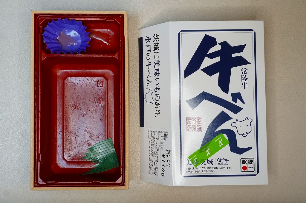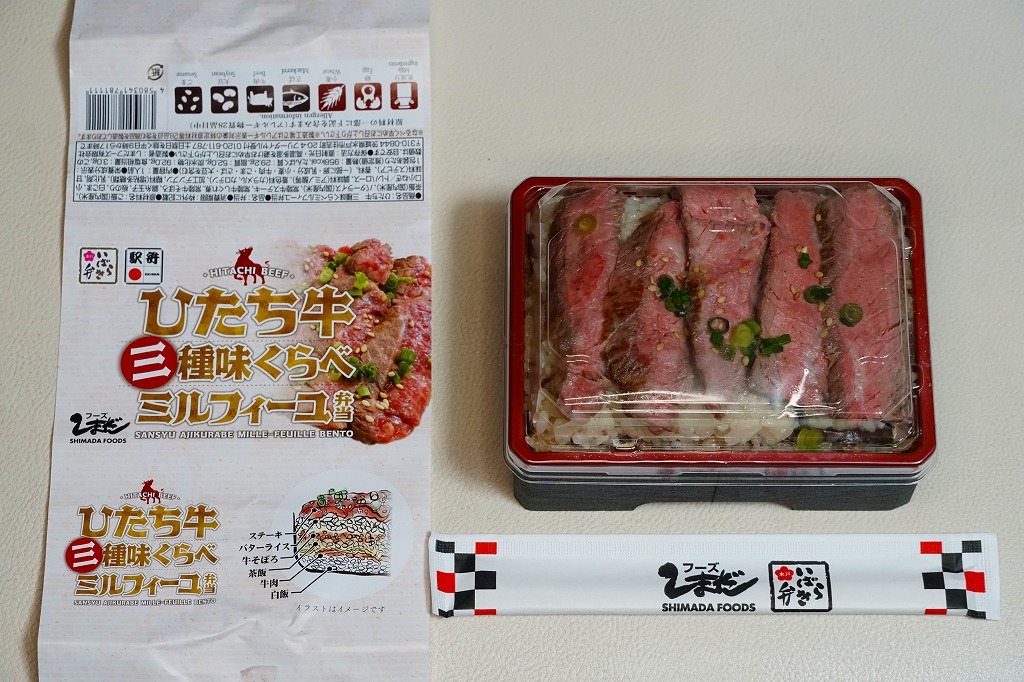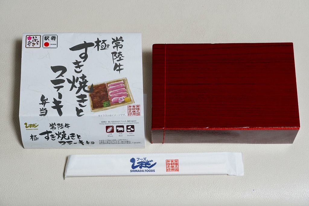 2023(令和5)年1月の京王百貨店の駅弁大会で、これと 「常陸牛のロースステーキ弁当」と「常陸牛のロースステーキとローストビーフ贅沢盛り弁当」の3種を、水戸駅の駅弁として実演販売。最も安価なこれは、長方形の容器に白飯を詰め、常陸牛のロースステーキと牛肉煮で半分ずつ覆い、くりと青菜と煮玉子とタレと紅塩を添え、食材の写真が美しい赤い掛紙を巻いた。まだ赤くて噛み切れない牛ステーキと、干物のように味が濃縮した牛すき焼きが印象的で、こんな駅弁は見たことがない。駅弁を売る水戸駅のコンビニで見ることが、できたかどうか。