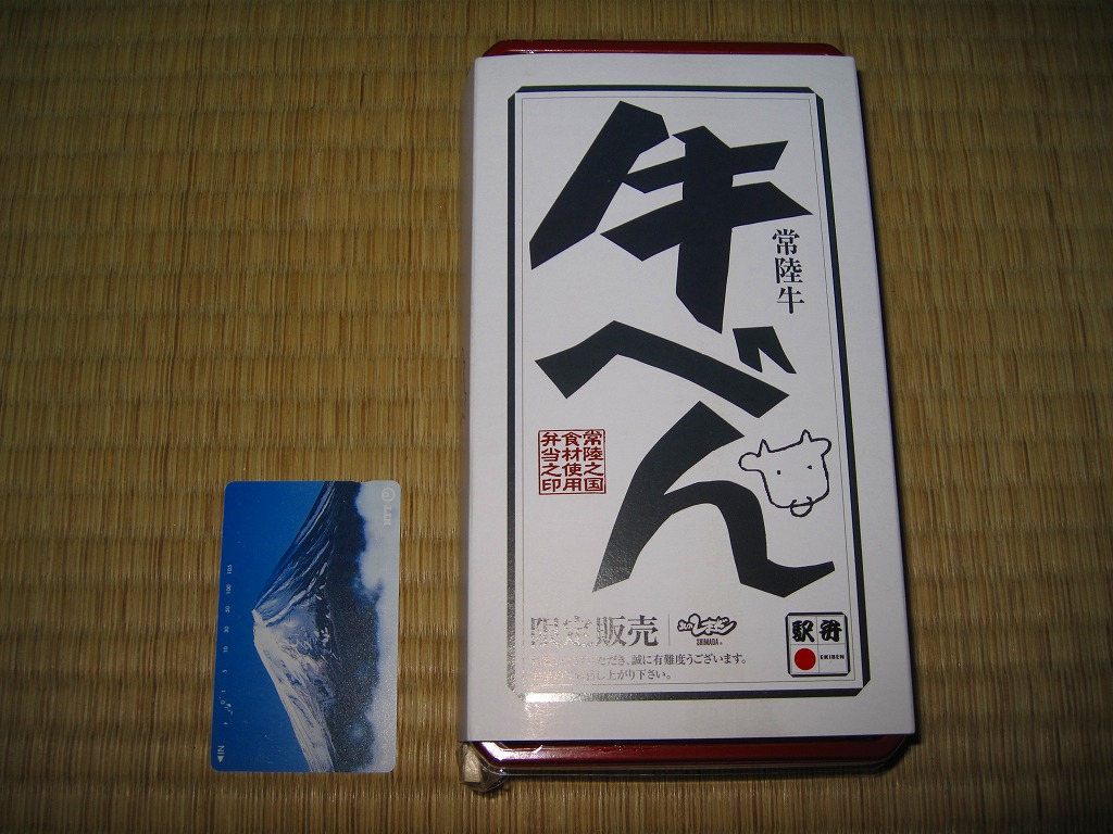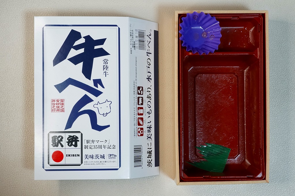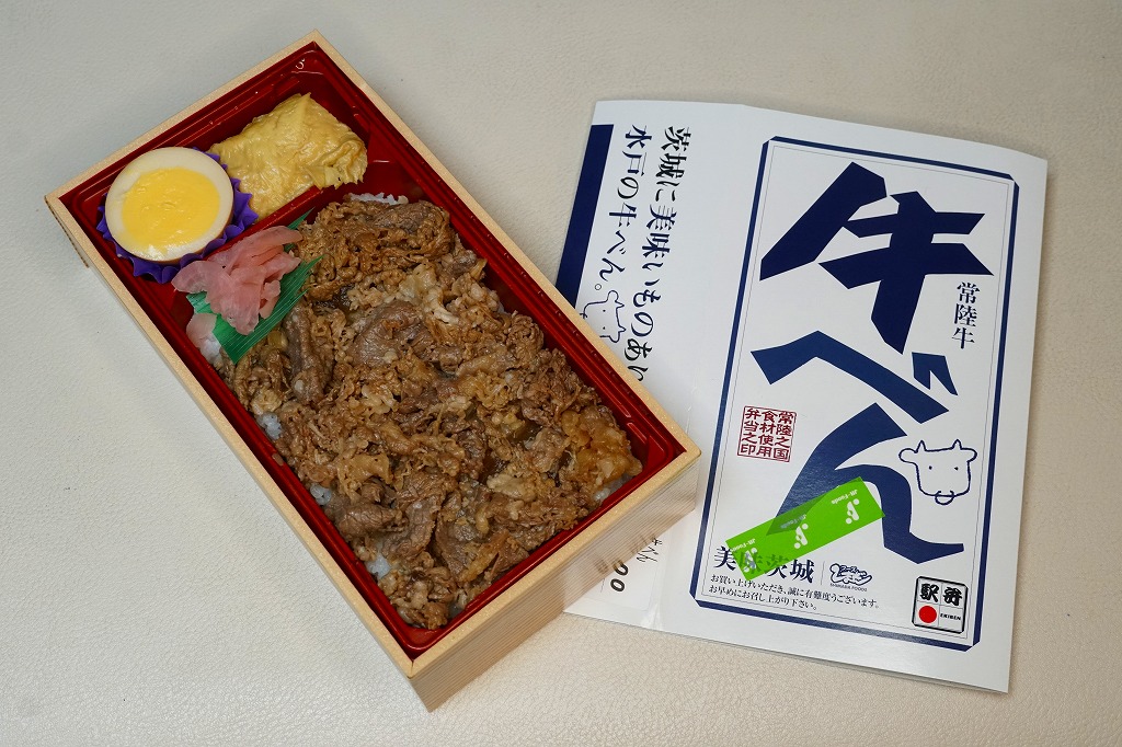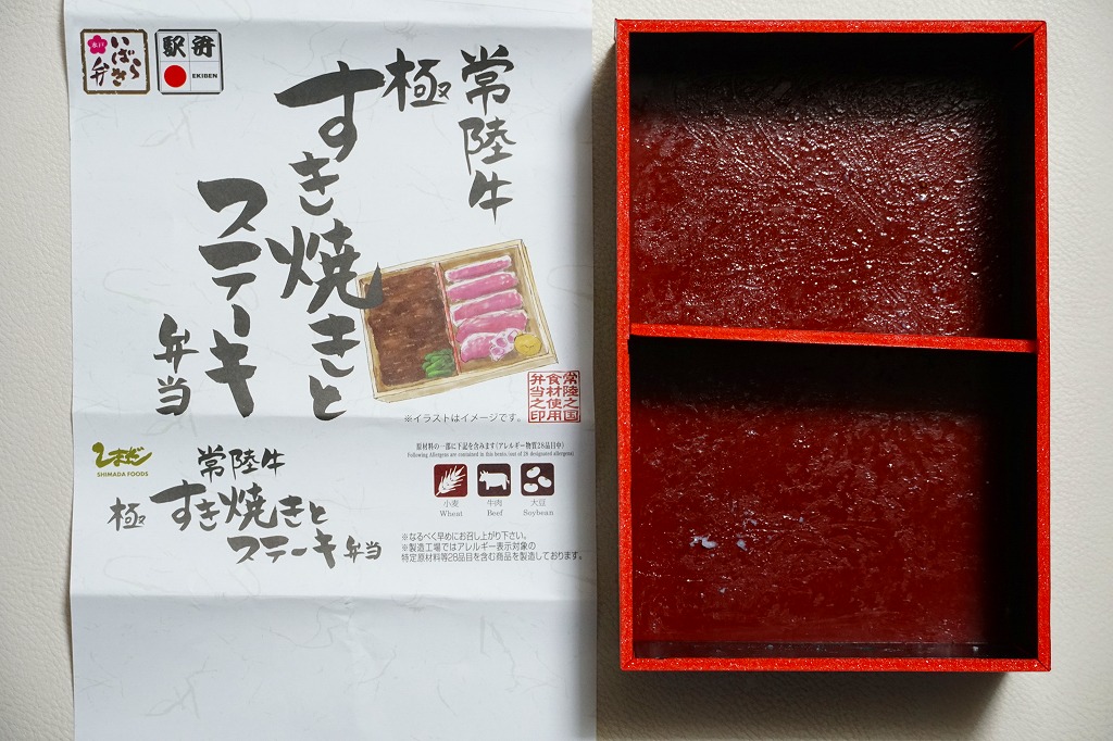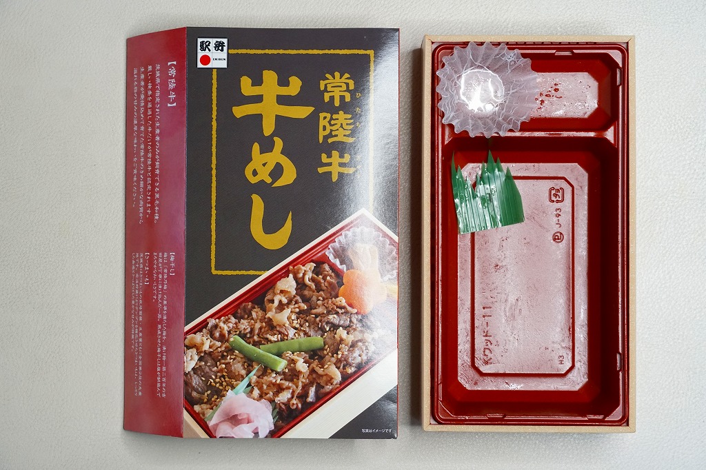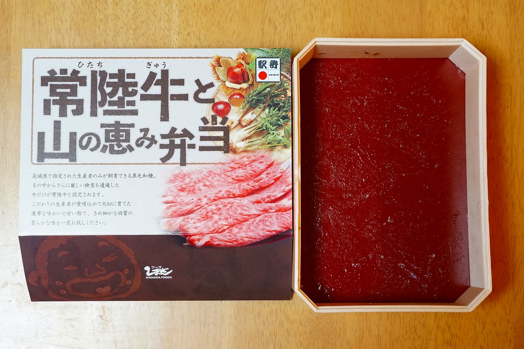 2023(令和5)年1月の京王百貨店の駅弁大会で、これと 「常陸牛のロースステーキ弁当」と「常陸牛のロースステーキとローストビーフ贅沢盛り弁当」の3種を、水戸駅の駅弁として実演販売。最も安価なこれは、長方形の容器に白飯を詰め、常陸牛のロースステーキと牛肉煮で半分ずつ覆い、くりと青菜と煮玉子とタレと紅塩を添え、食材の写真が美しい赤い掛紙を巻いた。まだ赤くて噛み切れない牛ステーキと、干物のように味が濃縮した牛すき焼きが印象的で、こんな駅弁は見たことがない。駅弁を売る水戸駅のコンビニで見ることが、できたかどうか。